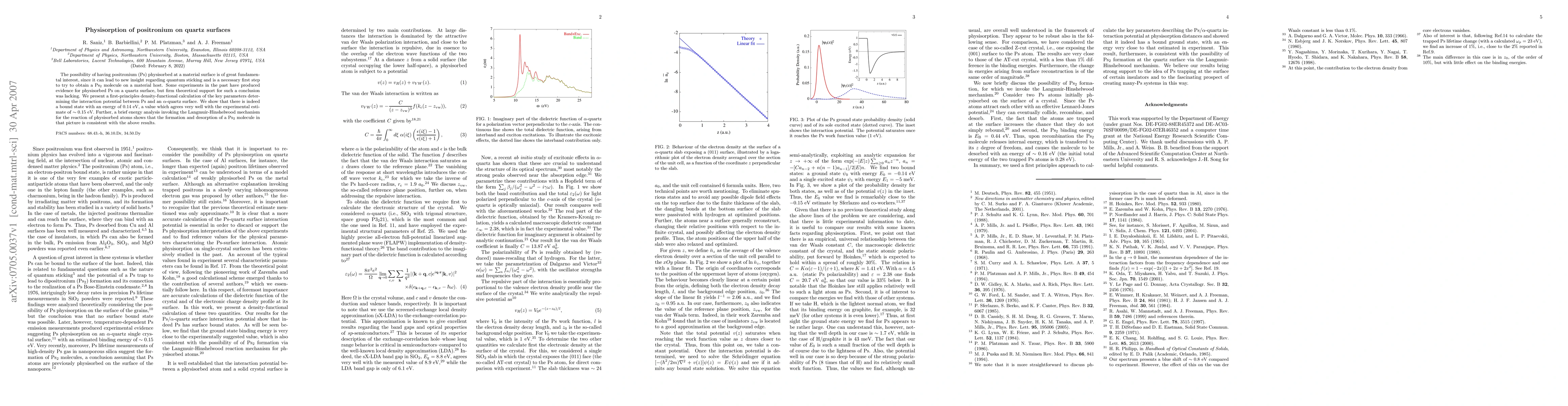 The possibility of having positronium (Ps) physisorbed at a material surface is of great fundamental interest, since it can lead to new insight regarding quantum sticking and is a necessary first step to try to obtain a Ps$_2$ molecule on a material host. Some experiments in the past have produced evidence for physisorbed Ps on a quartz surface, but firm theoretical support for such a conclusion was lacking. We present a first-principles density-functional calculation of the key parameters determining the interaction potential between Ps and an $\alpha$-quartz surface. We show that there is indeed a bound state with an energy of 0.14 eV, a value which agrees very well with the experimental estimate of $\sim0.15$ eV. Further, a brief energy analysis invoking the Langmuir-Hinshelwood mechanism for the reaction of physisorbed atoms shows that the formation and desorption of a Ps$_2$ molecule in that picture is consistent with the above results.