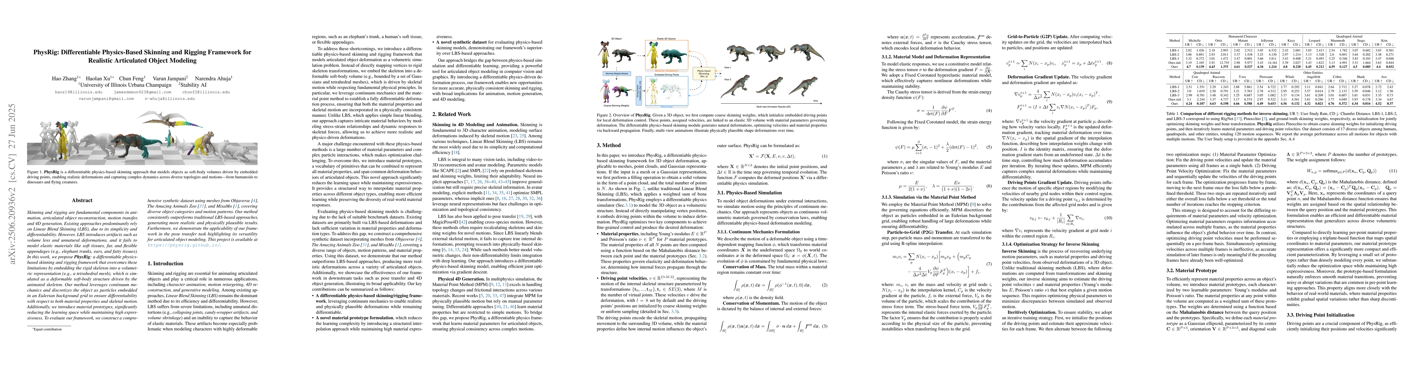 The paper proposes PhysRig, a differentiable physics-based skinning and rigging framework that embeds skeletons into a volumetric soft-body representation simulated via continuum mechanics, utilizing material prototypes and an alternating optimization strategy for material and velocity parameters.