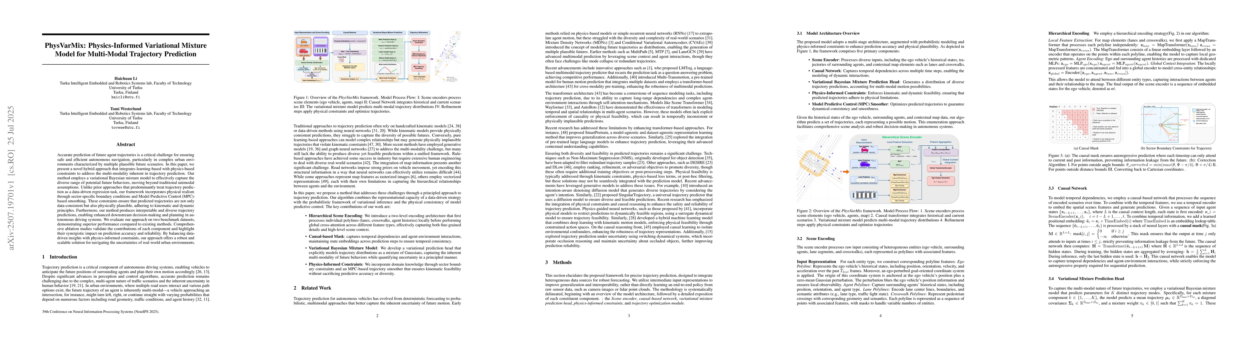 Accurate prediction of future agent trajectories is a critical challenge for ensuring safe and efficient autonomous navigation, particularly in complex urban environments characterized by multiple plausible future scenarios. In this paper, we present a novel hybrid approach that integrates learning-based with physics-based constraints to address the multi-modality inherent in trajectory prediction. Our method employs a variational Bayesian mixture model to effectively capture the diverse range of potential future behaviors, moving beyond traditional unimodal assumptions. Unlike prior approaches that predominantly treat trajectory prediction as a data-driven regression task, our framework incorporates physical realism through sector-specific boundary conditions and Model Predictive Control (MPC)-based smoothing. These constraints ensure that predicted trajectories are not only data-consistent but also physically plausible, adhering to kinematic and dynamic principles. Furthermore, our method produces interpretable and diverse trajectory predictions, enabling enhanced downstream decision-making and planning in autonomous driving systems. We evaluate our approach on two benchmark datasets, demonstrating superior performance compared to existing methods. Comprehensive ablation studies validate the contributions of each component and highlight their synergistic impact on prediction accuracy and reliability. By balancing data-driven insights with physics-informed constraints, our approach offers a robust and scalable solution for navigating the uncertainties of real-world urban environments.