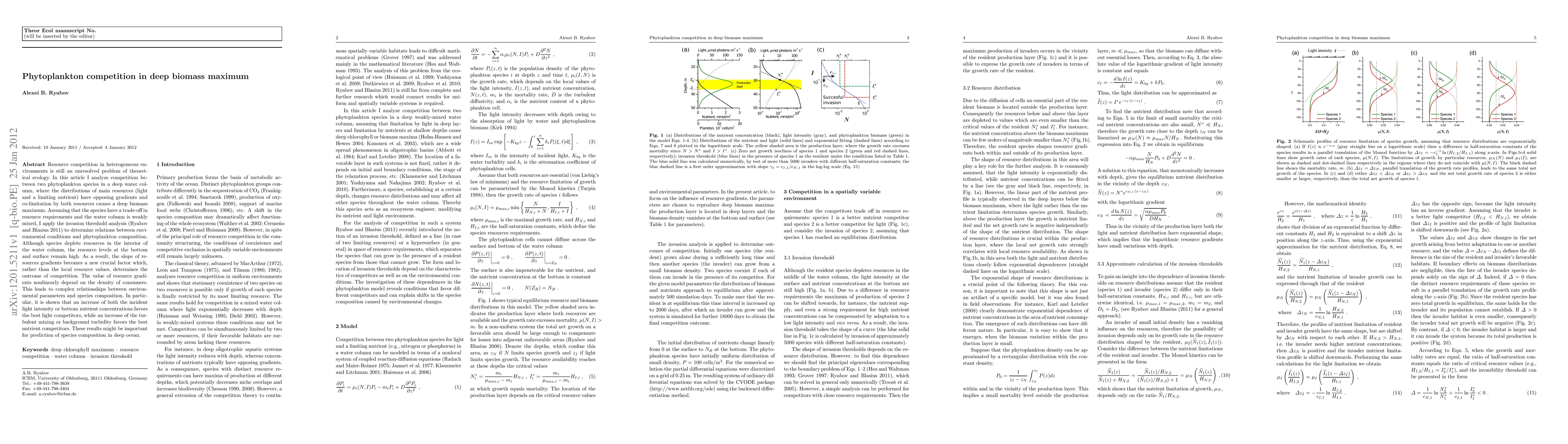 Phytoplankton competition in deep water is influenced by gradients of resources like light and nutrients, with stronger slopes favoring certain species. Environmental factors like mixing and turbidity also play a crucial role in determining species composition.