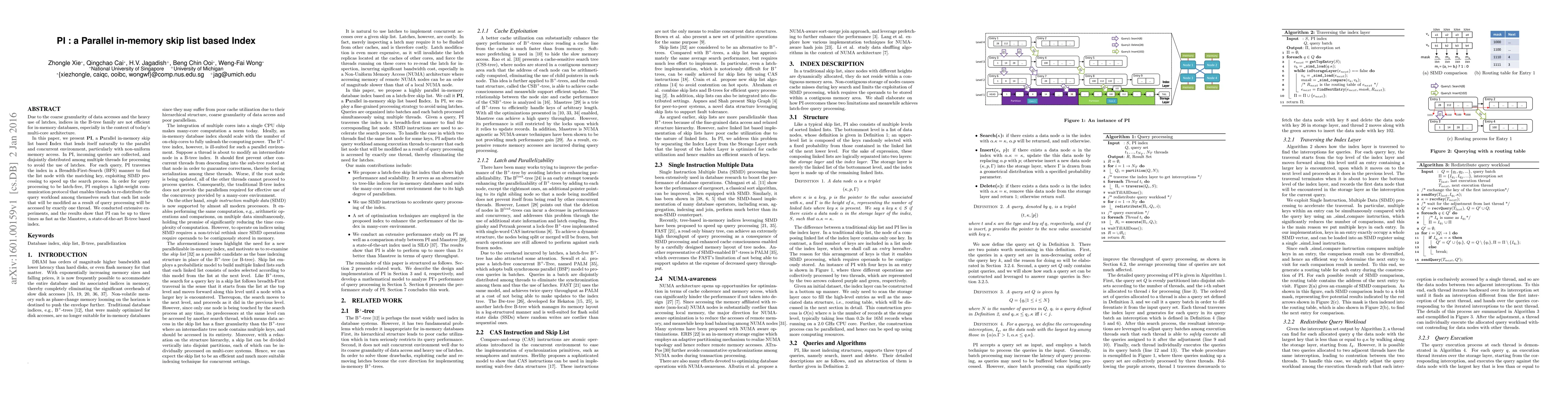 This paper introduces PI, a Parallel in-memory skip list based Index designed for efficient query processing in multi-core architectures, avoiding latches and leveraging SIMD and BFS traversal. Experimental results demonstrate PI's performance is up to three times faster than the state-of-the-art Masstree B-tree index.