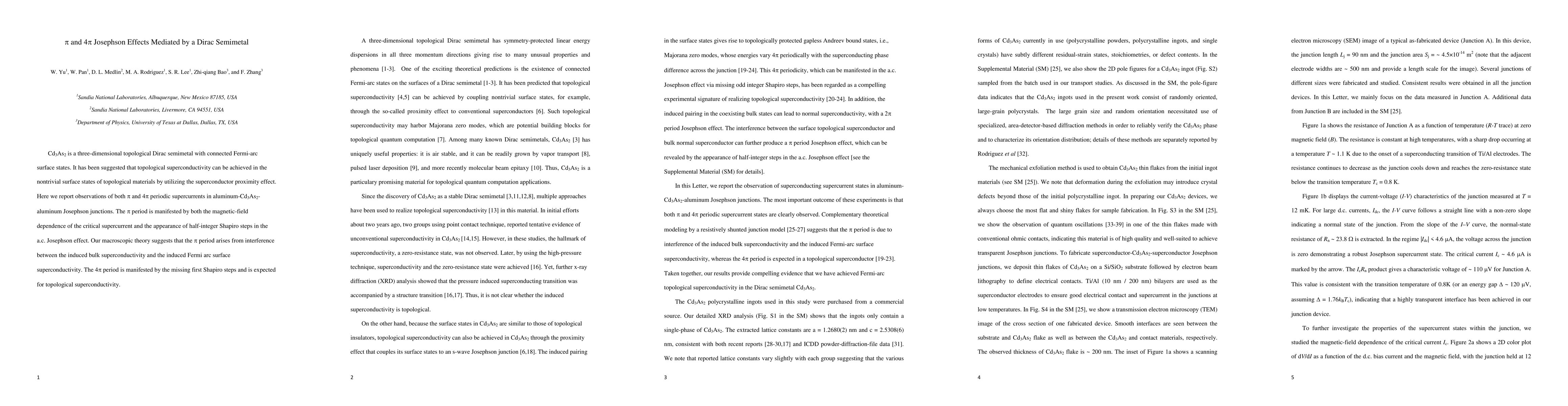 This paper reports the observation of both π and 4π periodic supercurrents in Josephson junctions formed with the topological Dirac semimetal Cd3As2, indicating the presence of topological superconductivity. The π periodicity is attributed to interference between bulk and surface superconductivity, while the 4π periodicity is a hallmark of topological superconductivity.