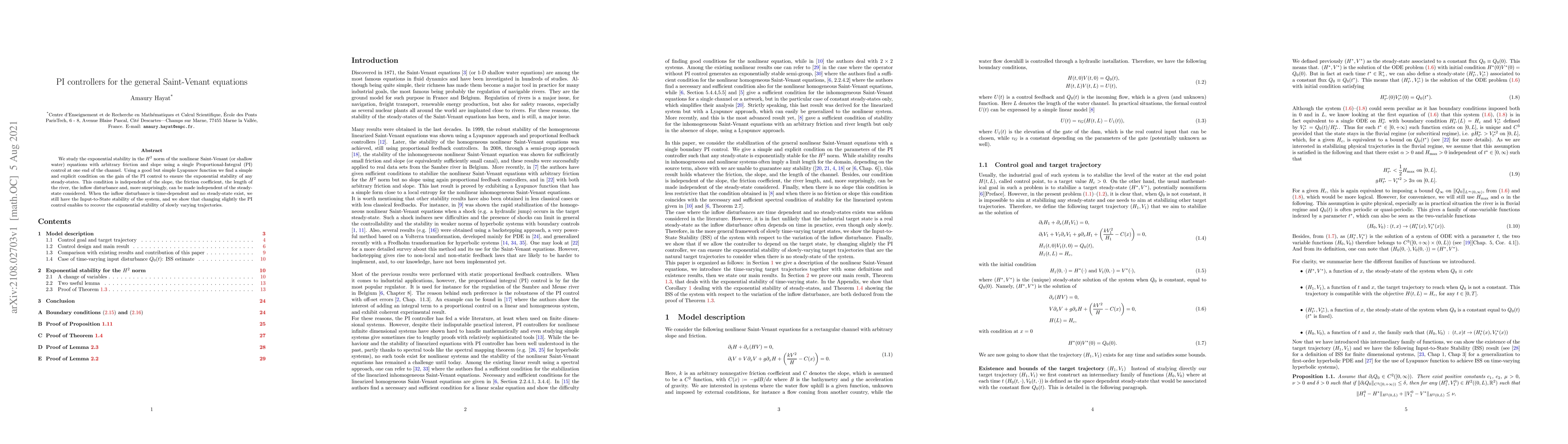 This paper investigates the exponential stability of the Saint-Venant equations using a single Proportional-Integral (PI) control, finding a gain condition that ensures stability regardless of various parameters. It also demonstrates Input-to-State stability and recovery of exponential stability for time-dependent disturbances.