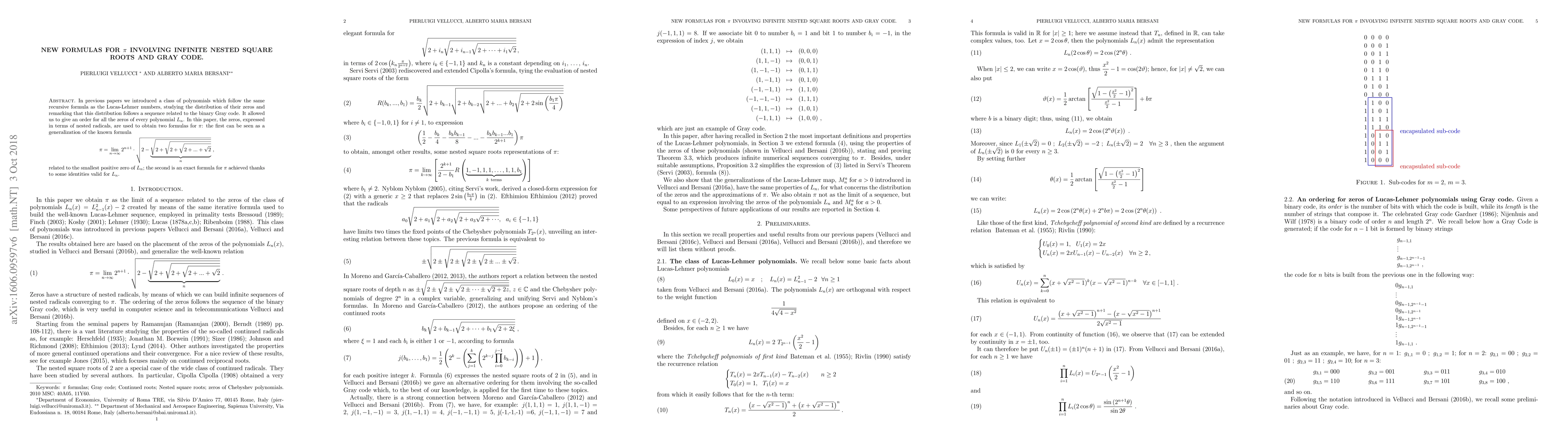 This paper explores $\pi$-formulas derived from a class of polynomials resembling Lucas-Lehmer numbers, whose zeros follow a sequence linked to the binary Gray code. It presents two $\pi$ formulas: one generalizing a known limit-based formula and another exact formula leveraging identities of these polynomials.