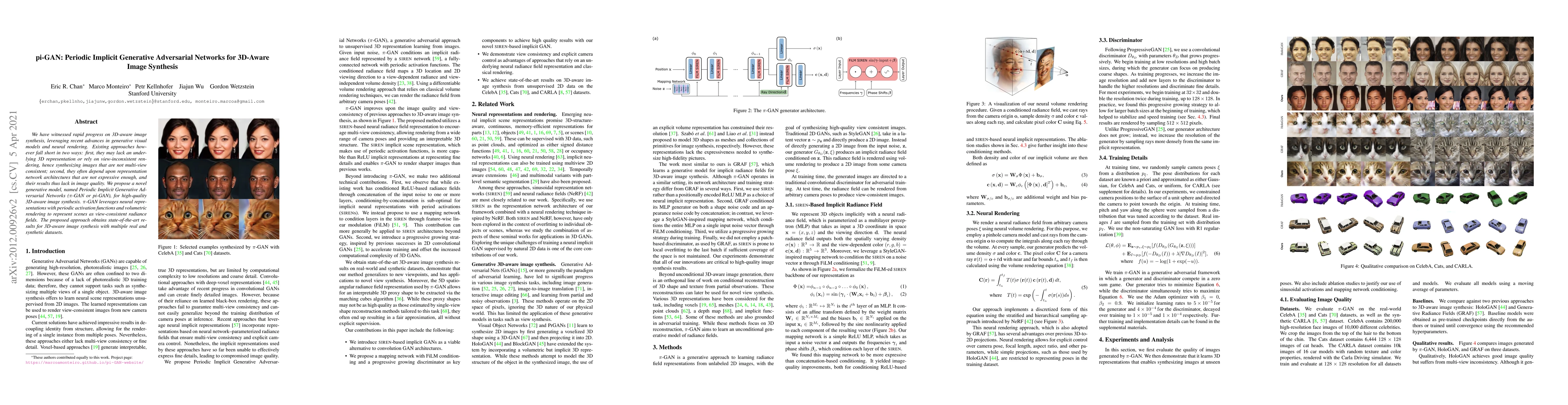The pi-GAN model introduces periodic implicit generative adversarial networks for high-quality 3D-aware image synthesis, addressing inconsistencies and improving expressiveness through neural representations with periodic activation functions and volumetric rendering. It achieves state-of-the-art results for multi-view consistent 3D image generation.