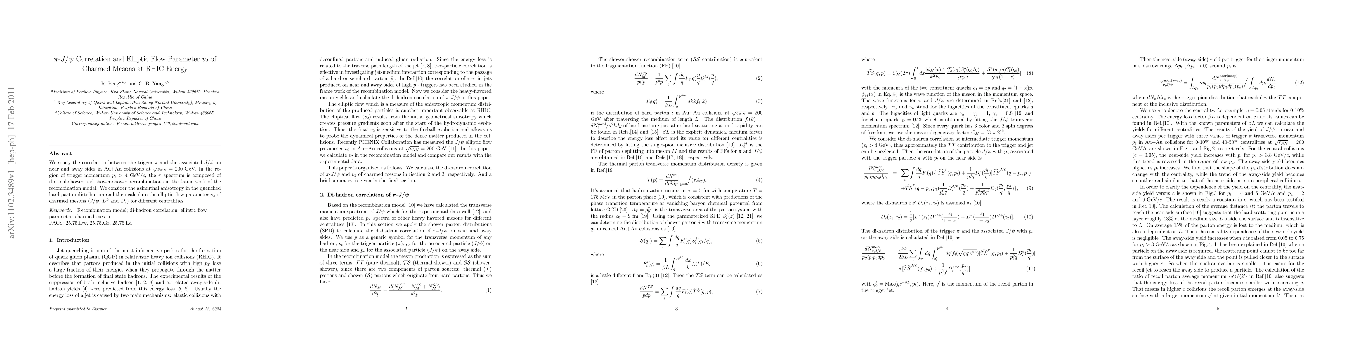 We study the correlation between the trigger $\pi$ and the associated $J/\psi$ on near and away sides in Au+Au collisions at $\sqrt{s_{NN}}=200$ GeV. In the region of trigger momentum $p_t>4$ GeV/$c$, the $\pi$ spectrum is composed of thermal-shower and shower-shower recombinations in the frame work of the recombination model. We consider the azimuthal anisotropy in the quenched hard parton distribution and then calculate the elliptic flow parameter $v_2$ of charmed mesons ($J/\psi$, $D^0$ and $D_s$) for different centralities.