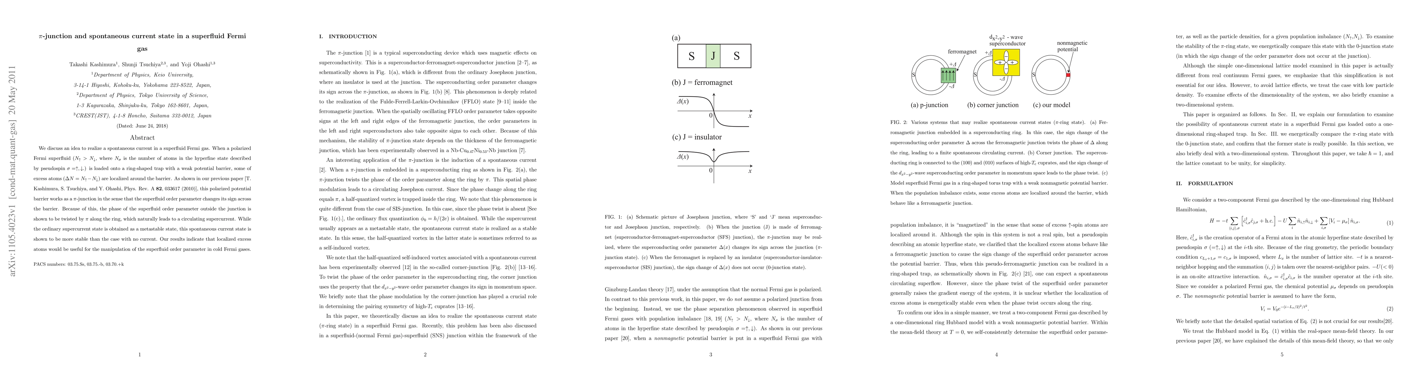 We discuss an idea to realize a spontaneous current in a superfluid Fermi gas. When a polarized Fermi superfluid ($N_\up > N_\dwn$, where $N_\sigma$ is the number of atoms in the hyperfine state described by pseudospin $\sigma=\uparrow, \downarrow$.) is loaded onto a ring-shaped trap with a weak potential barrier, some of excess atoms ($\Delta N=N_\uparrow-N_\downarrow$) are localized around the barrier. As shown in our previous paper [T. Kashimura, S. Tsuchiya, and Y. Ohashi, Phys. Rev. A \textbf{82}, 033617 (2010)], this polarized potential barrier works as a $\pi$-junction in the sense that the superfluid order parameter changes its sign across the barrier. Because of this, the phase of the superfluid order parameter outside the junction is shown to be twisted by $\pi$ along the ring, which naturally leads to a circulating supercurrent. While the ordinary supercurrent state is obtained as a metastable state, this spontaneous current state is shown to be more stable than the case with no current. Our results indicate that localized excess atoms would be useful for the manipulation of the superfluid order parameter in cold Fermi gases.