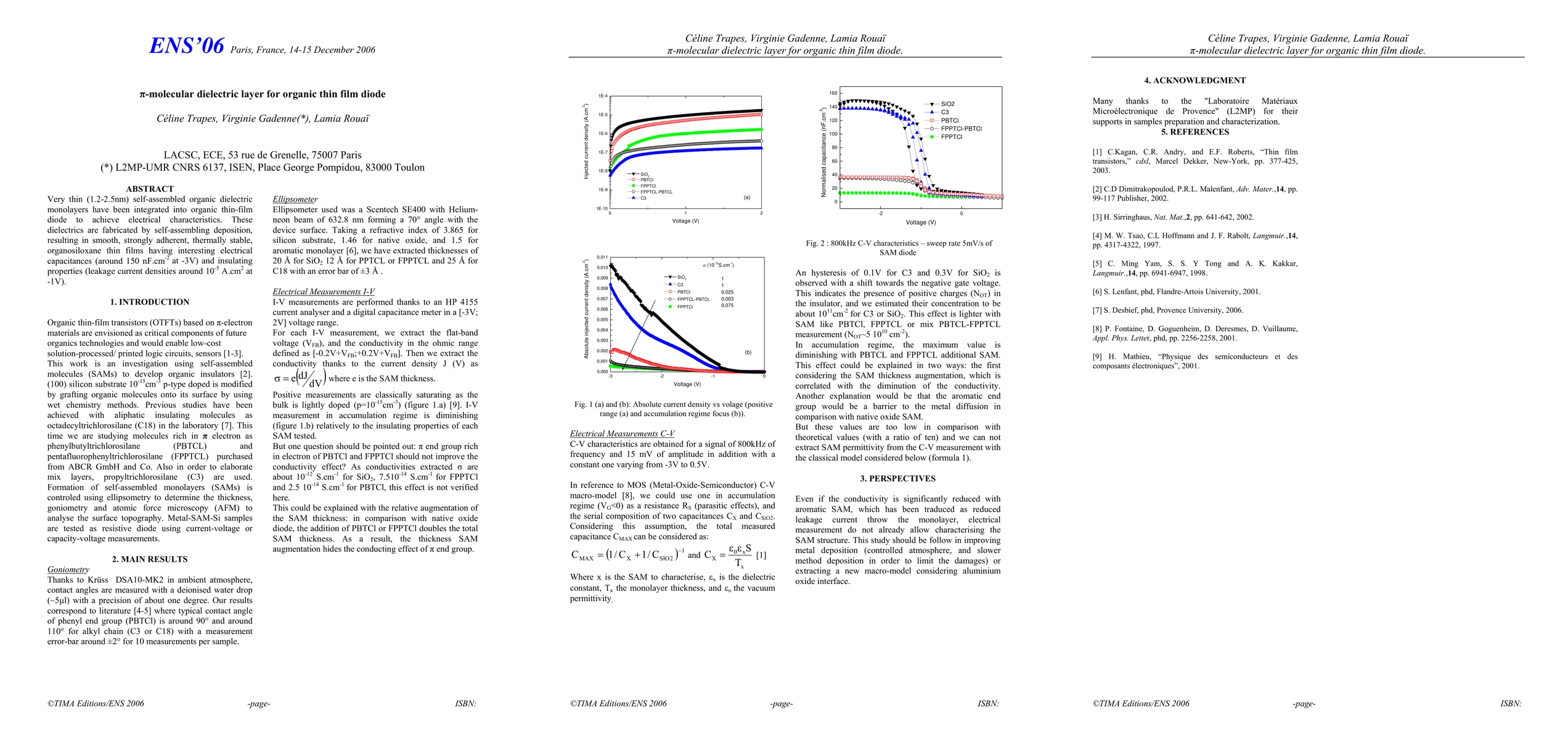 Very thin (1.2-2.5nm) self-assembled organic dielectric monolayers have been integrated into organic thin-film diode to achieve electrical characteristics. These dielectrics are fabricated by self-assembling deposition, resulting in smooth, strongly adherent, thermally stable, organosiloxane thin films having interesting electrical capacitances (around 150 nF cm-2 at -3V) and insulating properties (leakage current densities around 10-5 A cm2 at -1V).