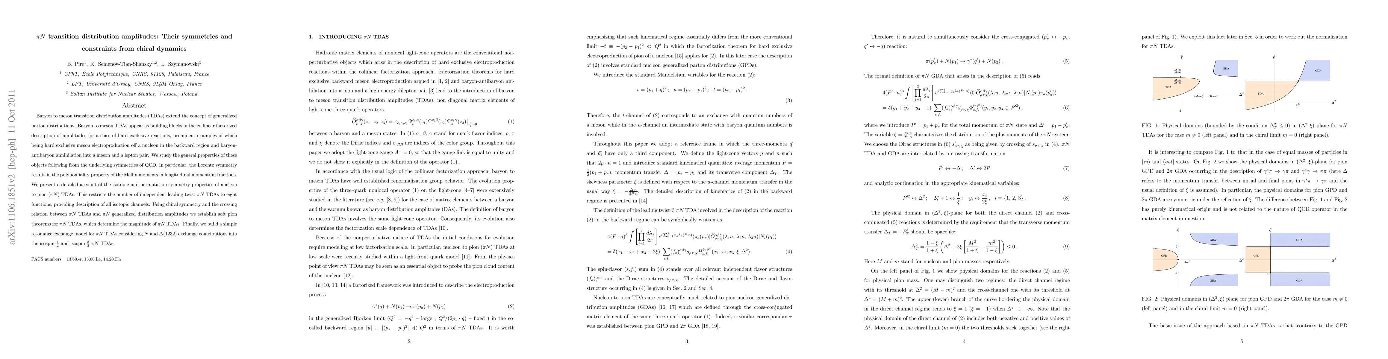 This paper investigates baryon to meson transition distribution amplitudes (TDAs), focusing on nucleon to pion (\pi N) TDAs, and derives their symmetries and constraints from chiral dynamics. It establishes soft pion theorems and a simple resonance exchange model to describe the leading twist \pi N TDAs.
