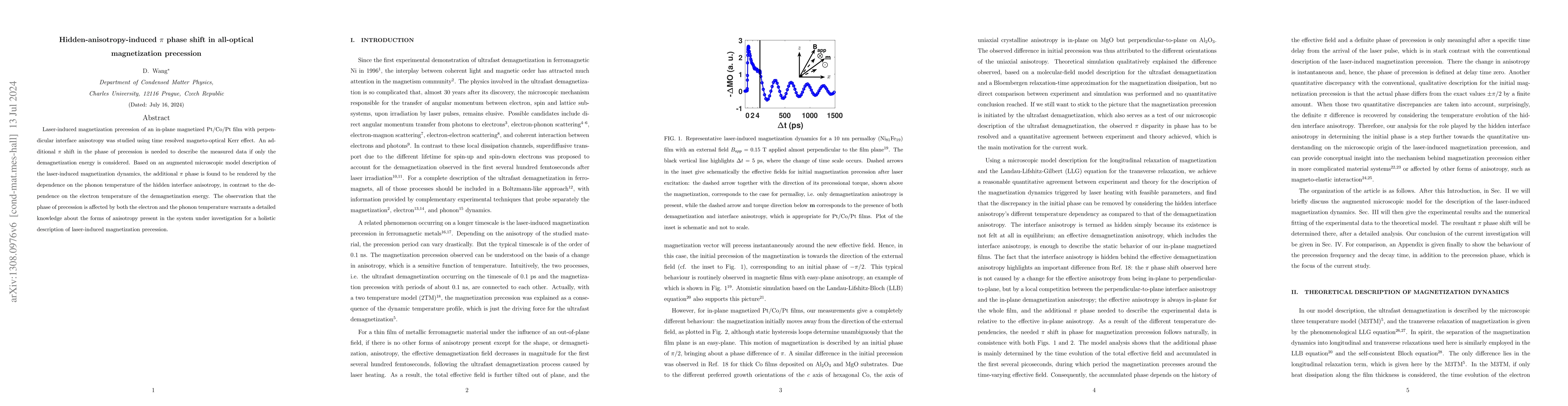 This study investigates laser-induced magnetization precession in a Pt/Co/Pt film with perpendicular interface anisotropy, revealing a $\pi$ phase shift in precession not explained by effective easy-plane anisotropy alone. The $\pi$ phase shift is attributed to the phonon temperature dependence of interface anisotropy, highlighting the need for comprehensive anisotropy understanding in laser-induced magnetization processes.