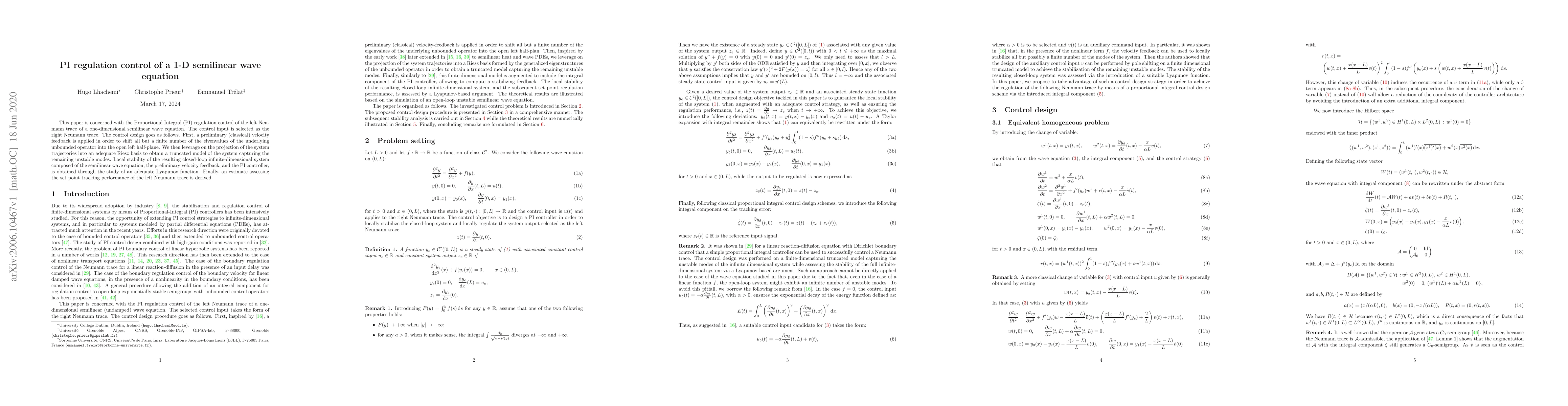 This paper is concerned with the Proportional Integral (PI) regulation control of the left Neu-mann trace of a one-dimensional semilinear wave equation. The control input is selected as the right Neumann trace. The control design goes as follows. First, a preliminary (classical) velocity feedback is applied in order to shift all but a finite number of the eivenvalues of the underlying unbounded operator into the open left half-plane. We then leverage on the projection of the system trajectories into an adequate Riesz basis to obtain a truncated model of the system capturing the remaining unstable modes. Local stability of the resulting closed-loop infinite-dimensional system composed of the semilinear wave equation, the preliminary velocity feedback, and the PI controller, is obtained through the study of an adequate Lyapunov function. Finally, an estimate assessing the set point tracking performance of the left Neumann trace is derived.