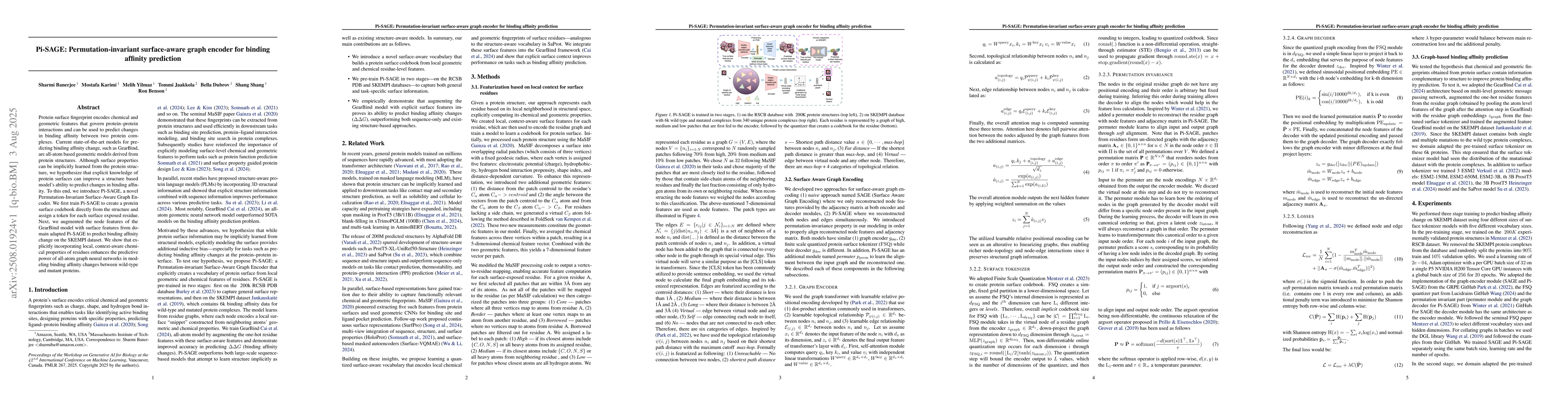 Protein surface fingerprint encodes chemical and geometric features that govern protein-protein interactions and can be used to predict changes in binding affinity between two protein complexes. Current state-of-the-art models for predicting binding affinity change, such as GearBind, are all-atom based geometric models derived from protein structures. Although surface properties can be implicitly learned from the protein structure, we hypothesize that explicit knowledge of protein surfaces can improve a structure-based model's ability to predict changes in binding affinity. To this end, we introduce Pi-SAGE, a novel Permutation-Invariant Surface-Aware Graph Encoder. We first train Pi-SAGE to create a protein surface codebook directly from the structure and assign a token for each surface-exposed residue. Next, we augment the node features of the GearBind model with surface features from domain-adapted Pi-SAGE to predict binding affinity change on the SKEMPI dataset. We show that explicitly incorporating local, context-aware chemical properties of residues enhances the predictive power of all-atom graph neural networks in modeling binding affinity changes between wild-type and mutant proteins.