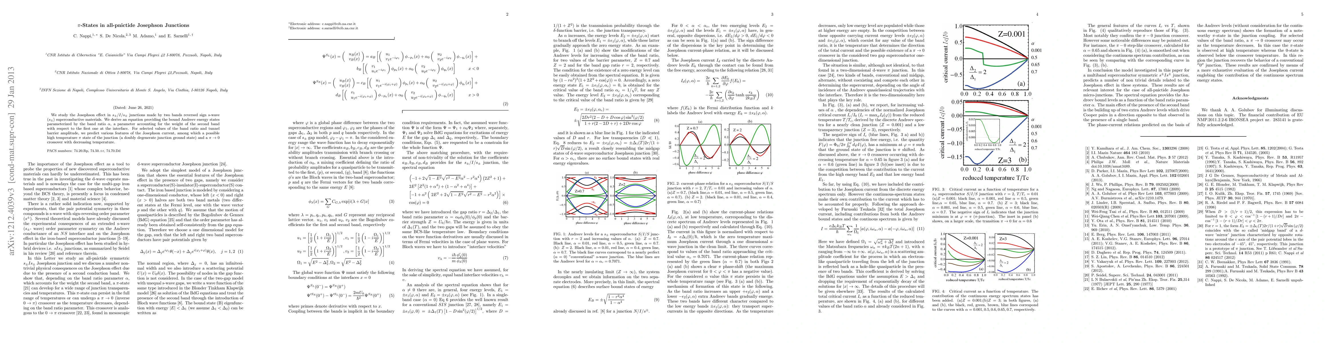 This paper investigates the Josephson effect in $s_{\pm}$ superconductor junctions, deriving an equation for bound Andreev states based on the band ratio $\alpha$. It predicts a high-temperature $\pi$ state and a $\pi \rightarrow 0$ crossover, showcasing unique junction behaviors.