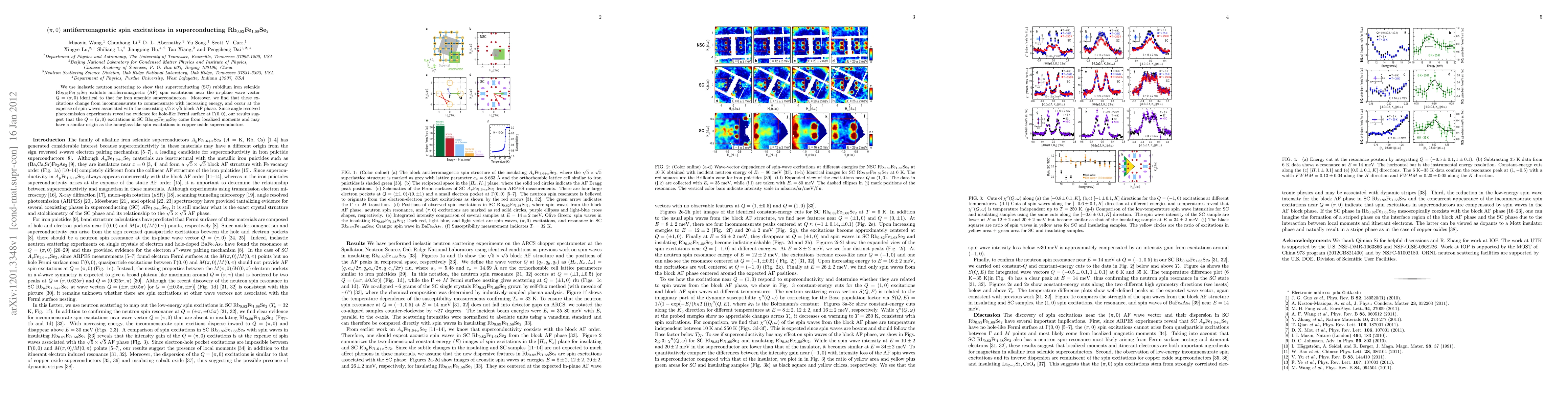 We use inelastic neutron scattering to show that superconducting (SC) rubidium iron selenide Rb0.82Fe1.68Se2 exhibits antiferromagnetic (AF) spin excitations near the in-plane wave vector Q = (PI, 0) identical to that for iron arsenide superconductors. Moreover, we find that these excitations change from incommensurate to commensurate with increasing energy, and occur at the expense of spin waves associated with the coexisting sqrt(5)\timessqrt(5) block AF phase. Since angle resolved photoemission experiments reveal no evidence for hole-like Fermi surface at Gamma(0, 0), our results suggest that the Q = (PI, 0) excitations in SC Rb0.82Fe1.68Se2 come from localized moments and may have a similar origin as the hourglass-like spin excitations in copper oxide superconductors.