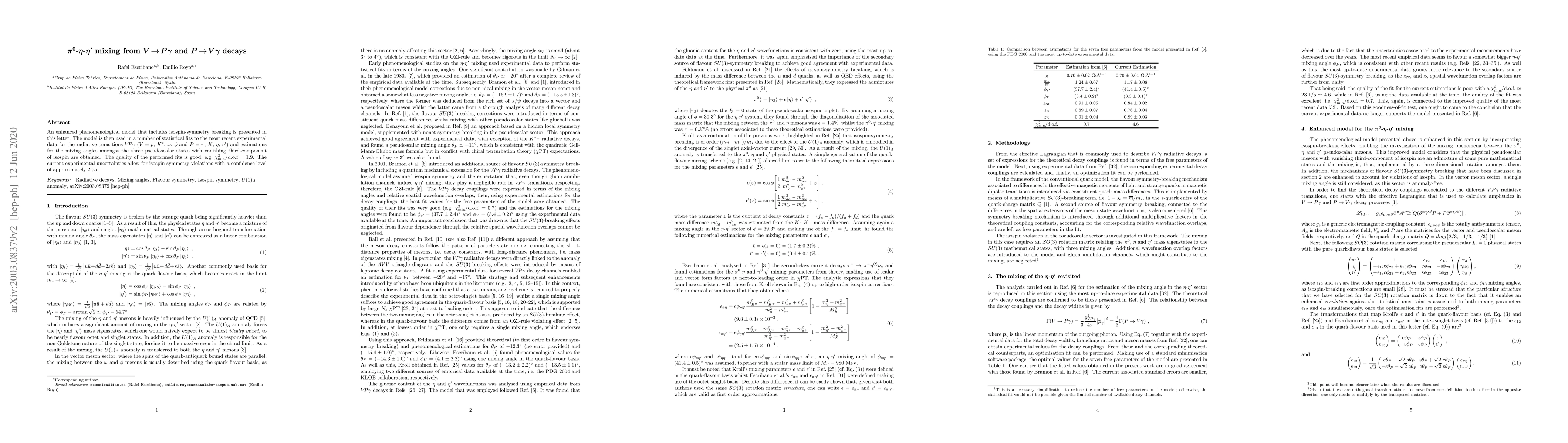 An enhanced phenomenological model that includes isospin-symmetry breaking is presented in this letter. The model is then used in a number of statistical fits to the most recent experimental data for the radiative transitions $V\!P\gamma$ ($V=\rho$, $K^*$, $\omega$, $\phi$ and $P=\pi$, $K$, $\eta$, $\eta^{\prime}$) and estimations for the mixing angles amongst the three pseudoscalar states with vanishing third-component of isospin are obtained. The quality of the performed fits is good, e.g. $\chi^2_{\textrm{min}}/\textrm{d.o.f} = 1.9$. The current experimental uncertainties allow for isospin symmetry violations with a confidence level of approximately $2.5\sigma$.