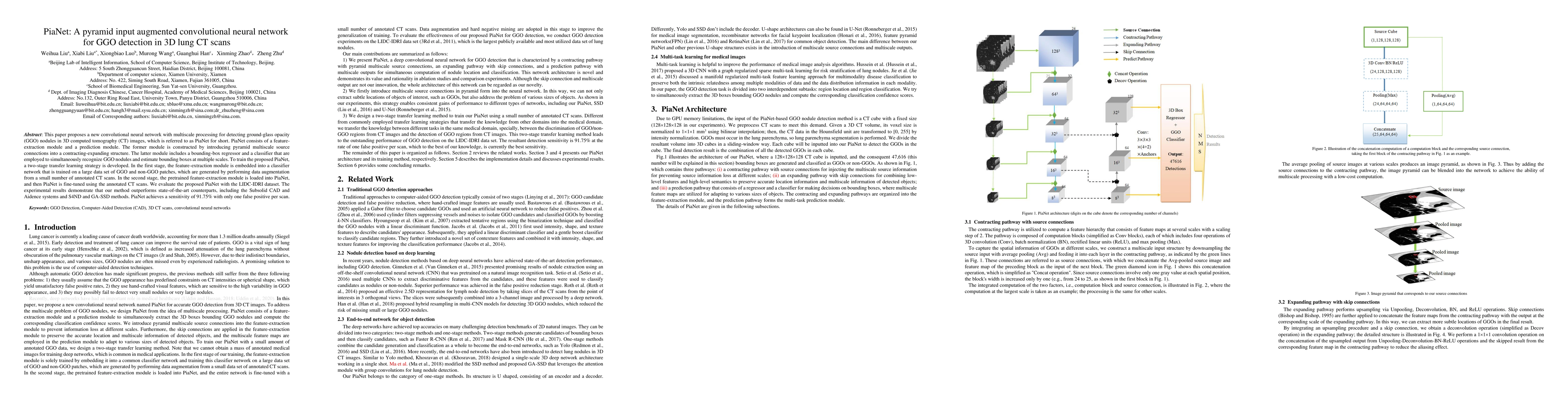 This paper proposes a new convolutional neural network with multiscale processing for detecting ground-glass opacity (GGO) nodules in 3D computed tomography (CT) images, which is referred to as PiaNet for short. PiaNet consists of a feature-extraction module and a prediction module. The former module is constructed by introducing pyramid multiscale source connections into a contracting-expanding structure. The latter module includes a bounding-box regressor and a classifier that are employed to simultaneously recognize GGO nodules and estimate bounding boxes at multiple scales. To train the proposed PiaNet, a two-stage transfer learning strategy is developed. In the first stage, the feature-extraction module is embedded into a classifier network that is trained on a large data set of GGO and non-GGO patches, which are generated by performing data augmentation from a small number of annotated CT scans. In the second stage, the pretrained feature-extraction module is loaded into PiaNet, and then PiaNet is fine-tuned using the annotated CT scans. We evaluate the proposed PiaNet on the LIDC-IDRI data set. The experimental results demonstrate that our method outperforms state-of-the-art counterparts, including the Subsolid CAD and Aidence systems and S4ND and GA-SSD methods. PiaNet achieves a sensitivity of 91.75% with only one false positive per scan
