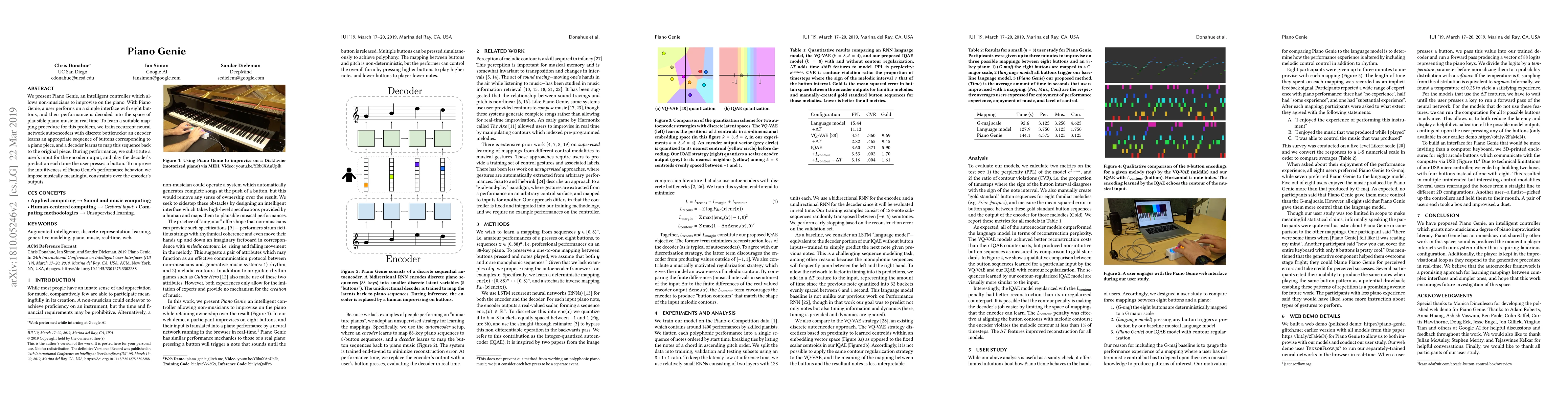 Piano Genie is an intelligent controller enabling non-musicians to improvise piano music through an interface of eight buttons. The system uses recurrent neural network autoencoders to decode button sequences into plausible piano music, incorporating musically meaningful constraints for intuitive performance.