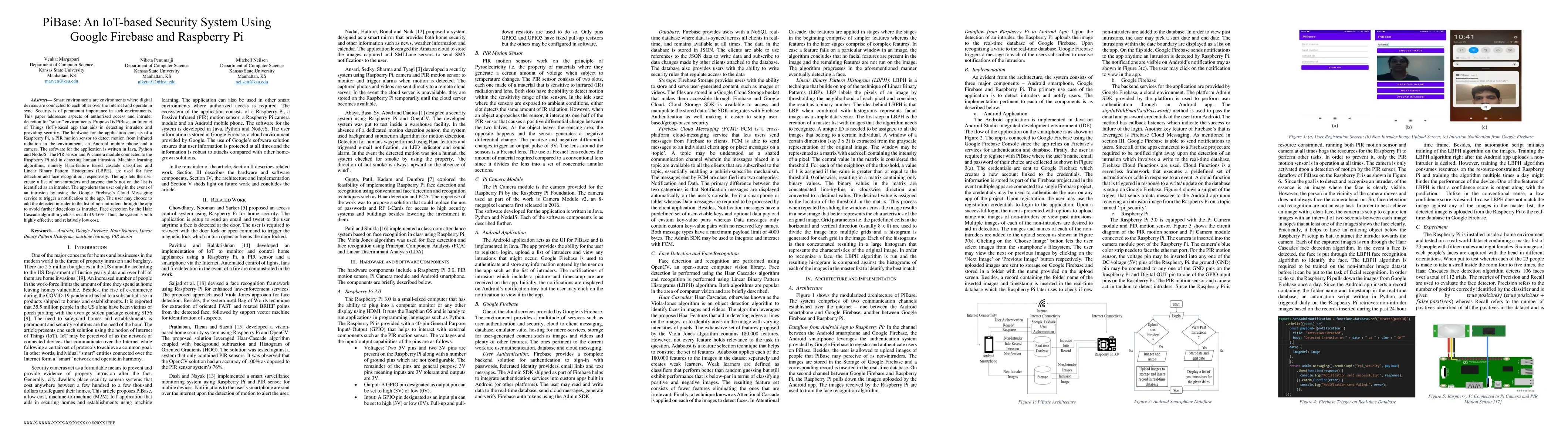 PiBase is an IoT-based security system using Raspberry Pi and Google Firebase to detect intruders in smart environments. It employs a PIR sensor, Pi camera, and machine learning algorithms for face detection and recognition, alerting users via notifications when unauthorized access is detected.