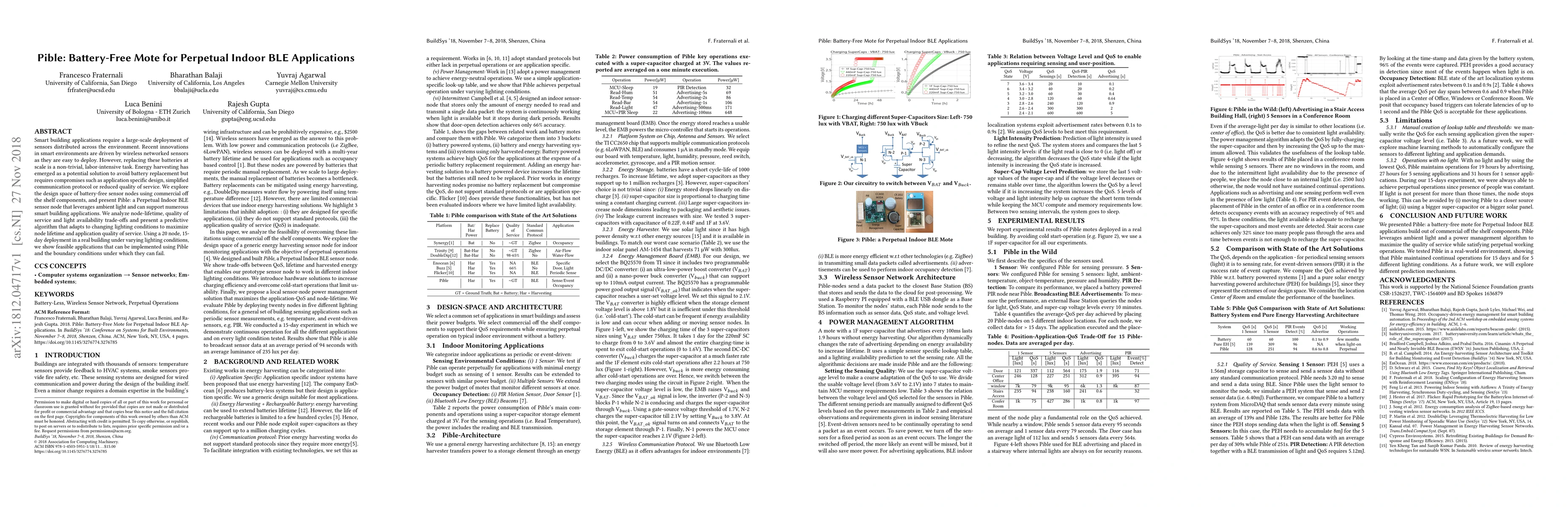 Smart building applications require a large-scale deployment of sensors distributed across the environment. Recent innovations in smart environments are driven by wireless networked sensors as they are easy to deploy. However, replacing these batteries at scale is a non-trivial, labor-intensive task. Energy harvesting has emerged as a potential solution to avoid battery replacement but requires compromises such as application specific design, simplified communication protocol or reduced quality of service. We explore the design space of battery-free sensor nodes using commercial off the shelf components, and present Pible: a Perpetual Indoor BLE sensor node that leverages ambient light and can support numerous smart building applications. We analyze node-lifetime, quality of service and light availability trade-offs and present a predictive algorithm that adapts to changing lighting conditions to maximize node lifetime and application quality of service. Using a 20 node, 15-day deployment in a real building under varying lighting conditions, we show feasible applications that can be implemented using Pible and the boundary conditions under which they can fail.