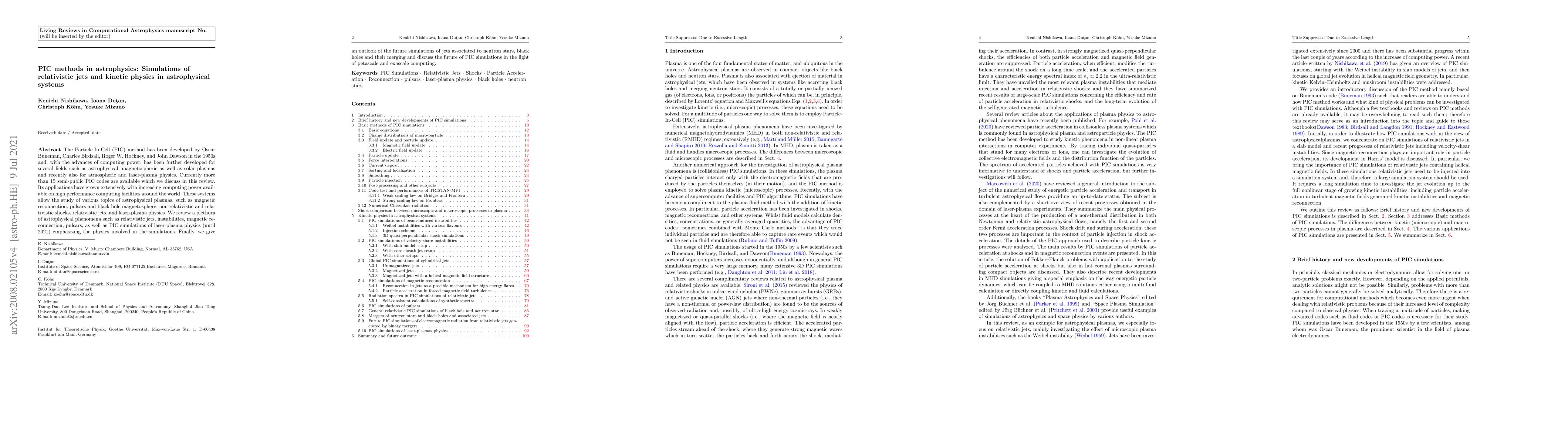The Particle-In-Cell (PIC) method has been developed by Oscar Buneman, Charles Birdsall, Roger W. Hockney, and John Dawson in the 1950s and, with the advances of computing power, has been further developed for several fields such as astrophysical, magnetospheric as well as solar plasmas and recently also for atmospheric and laser-plasma physics. Currently more than 15 semi-public PIC codes are available which we discuss in this review. Its applications have grown extensively with increasing computing power available on high performance computing facilities around the world. These systems allow the study of various topics of astrophysical plasmas, such as magnetic reconnection, pulsars and black hole magnetosphere, non-relativistic and relativistic shocks, relativistic jets, and laser-plasma physics. We review a plethora of astrophysical phenomena such as relativistic jets, instabilities, magnetic reconnection, pulsars, as well as PIC simulations of laser-plasma physics (until 2021) emphasizing the physics involved in the simulations. Finally, we give an outlook of the future simulations of jets associated to neutron stars, black holes and their merging and discuss the future of PIC simulations in the light of petascale and exascale computing.