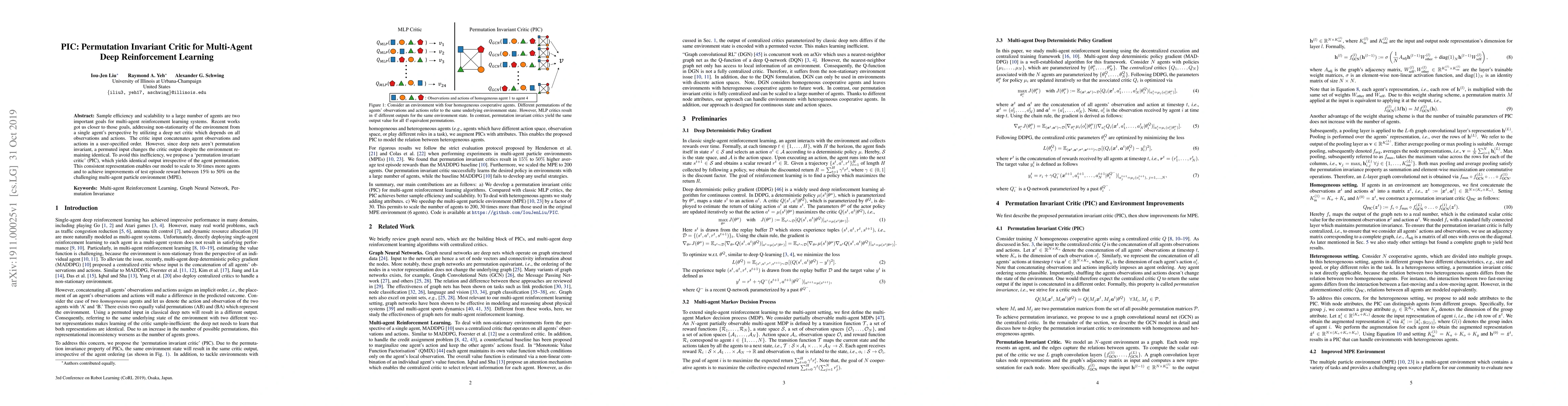 The paper proposes a "permutation invariant critic" (PIC) to enhance sample efficiency and scalability in multi-agent deep reinforcement learning. The PIC addresses the issue of non-permutation invariance in deep networks, enabling the model to scale to 30 times more agents and achieve significant improvements in reward in the multi-agent particle environment.