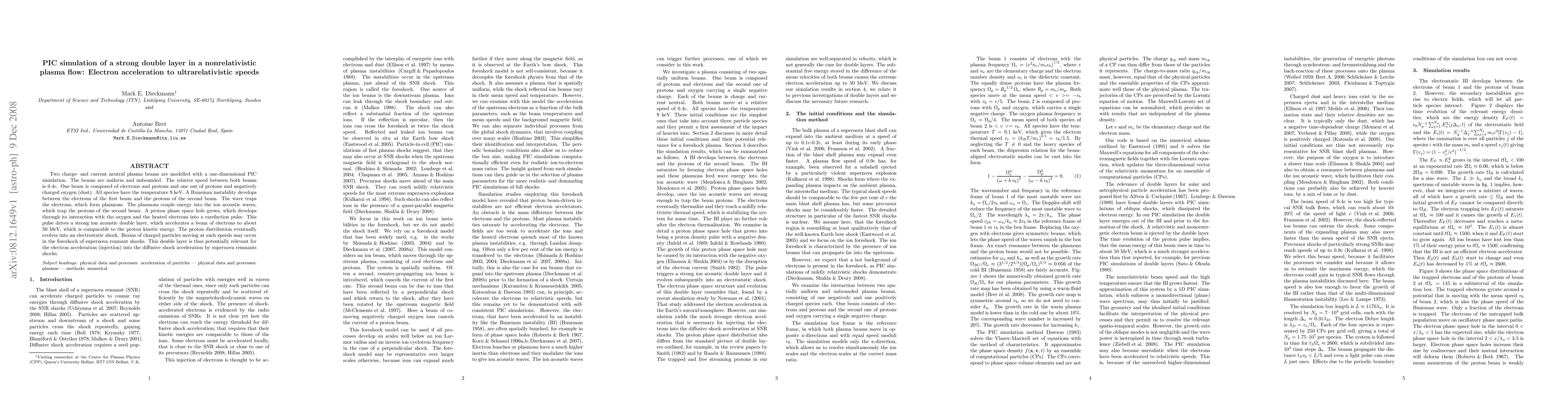 Two charge- and current neutral plasma beams are modelled with a one-dimensional PIC simulation. The beams are uniform and unbounded. The relative speed between both beams is 0.4c. One beam is composed of electrons and protons and one out of protons and negatively charged oxygen (dust). All species have the temperature 9 keV. A Buneman instability develops between the electrons of the first beam and the protons of the second beam. The wave traps the electrons, which form plasmons. The plasmons couple energy into the ion acoustic waves, which trap the protons of the second beam. A proton phase space hole grows, which develops through its interaction with the oxygen and the heated electrons into a rarefaction pulse. This pulse drives a strong ion acoustic double layer, which accelerates a beam of electrons to about 50 MeV, which is comparable to the proton kinetic energy. The proton distribution eventually evolves into an electrostatic shock. Beams of charged particles moving at such speeds may occur in the foreshock of supernova remnant shocks. This double layer is thus potentially relevant for the electron acceleration (injection) into the diffusive shock acceleration by supernova remnants shocks.