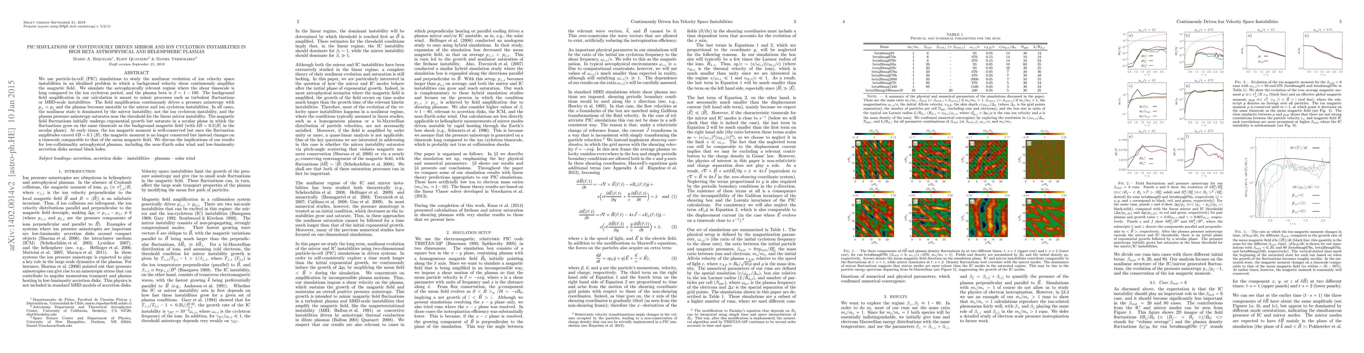 We use particle-in-cell (PIC) simulations to study the nonlinear evolution of ion velocity space instabilities in an idealized problem in which a background velocity shear continuously amplifies the magnetic field. We simulate the astrophysically relevant regime where the shear timescale is long compared to the ion cyclotron period, and the plasma beta is ~ 1-100. The background field amplification in our calculation is meant to mimic processes such as turbulent fluctuations or MHD-scale instabilities. The field amplification continuously drives a pressure anisotropy with the perpendicular pressure larger than the parallel pressure, and the plasma becomes unstable to the mirror and ion cyclotron instabilities. In all cases, the nonlinear state is dominated by the mirror instability, not the ion cyclotron instability, and the plasma pressure anisotropy saturates near the threshold for the linear mirror instability. The magnetic field fluctuations initially undergo exponential growth but saturate in a secular phase in which the fluctuations grow on the same timescale as the background magnetic field (with \delta B ~ 0.3 in the secular phase). At early times, the ion magnetic moment is well-conserved but once the fluctuation amplitudes exceed \delta B ~ 0.1 , the magnetic moment is no longer conserved but instead changes on a timescale comparable to that of the mean magnetic field. We discuss the implications of our results for low-collisionality astrophysical plasmas, including the near-Earth solar wind and low-luminosity accretion disks around black holes.