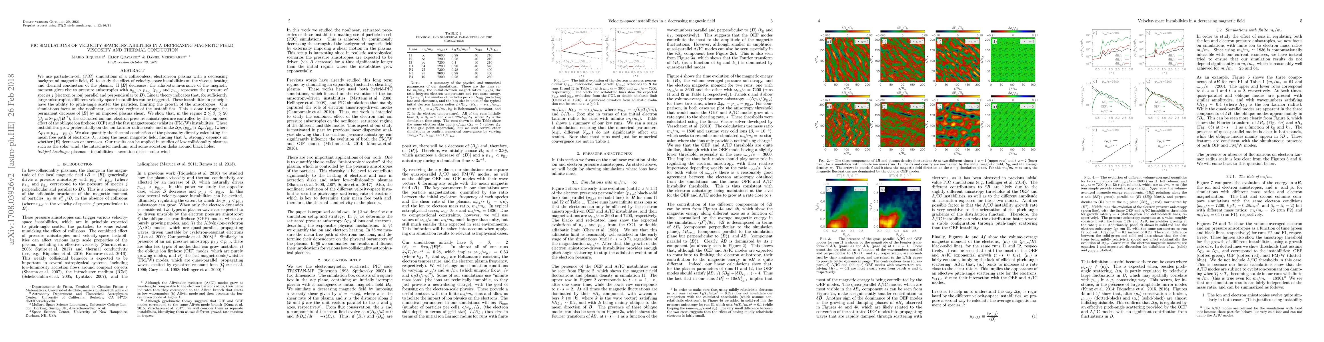 This paper uses PIC simulations to study velocity-space instabilities in a collisionless electron-ion plasma with a decreasing magnetic field, showing that these instabilities control pressure anisotropies and thermal conduction. The results indicate that the combined effect of ion and electron instabilities equalizes pressure anisotropies and that thermal conduction depends significantly on the magnetic field's direction of change.