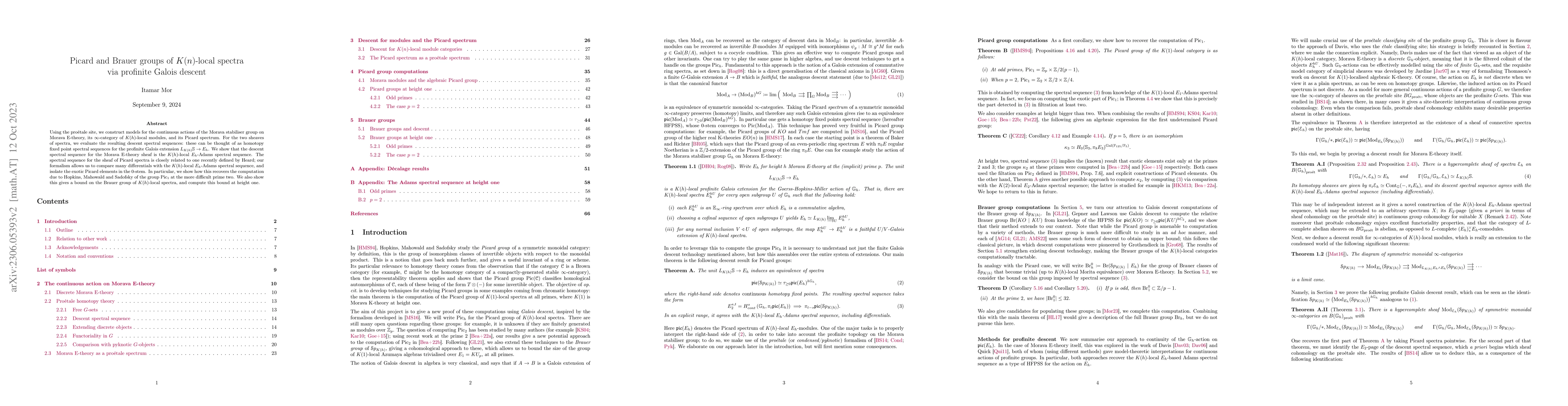 This paper constructs models for the continuous actions of the Morava stabiliser group on Morava E-theory and its $K(n)$-local module $\infty$-category using proétale descent. It shows that the descent spectral sequence for Morava E-theory is equivalent to the $K(n)$-local $E_n$-Adams spectral sequence and computes the Picard group $\mathrm{Pic}_1$ at all primes, as well as bounds and computes the Brauer group of $K(n)$-local spectra at height one.