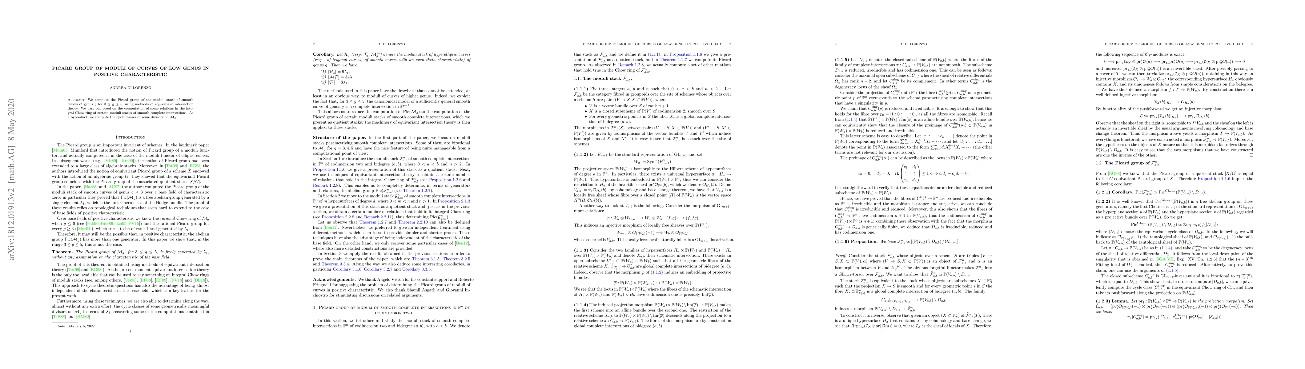This paper computes the Picard group of the moduli stack for smooth curves of genus $3\leq g\leq 5$ in positive characteristic, employing equivariant intersection theory and analyzing relations in the integral Chow ring of specific moduli stacks of complete intersections. It also provides cycle classes of certain divisors on $\mathcal{M}_g$.