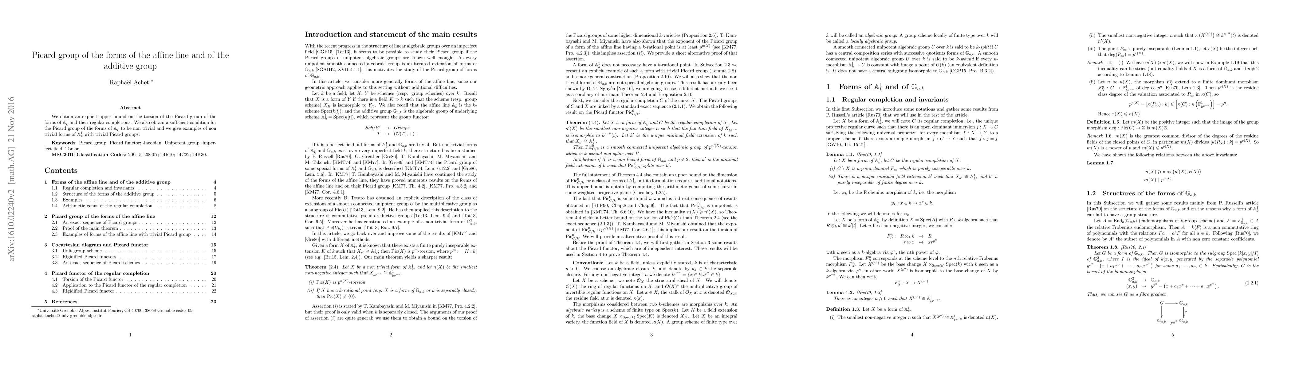 This paper provides an explicit upper bound on the torsion in the Picard group of forms of the affine line and their regular completions, along with a condition for the Picard group to be non-trivial, and examples of non-trivial forms with trivial Picard groups.