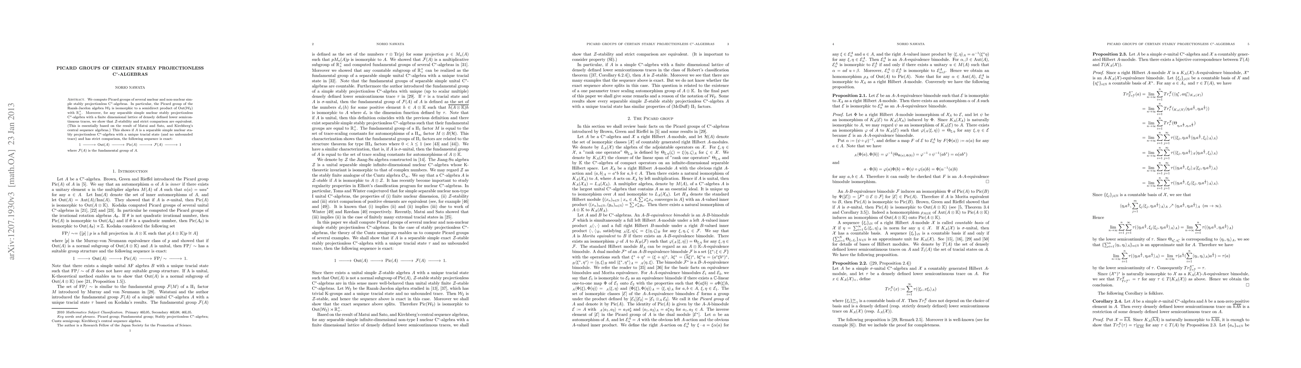 We compute Picard groups of several nuclear and non-nuclear simple stably projectionless C*-algebras. In particular, the Picard group of Razak-Jacelon algebra W_2 is isomorphic to a semidirect product of Out(W_2) with R_+^\times. Moreover, for any separable simple nuclear stably projectionless C*-algebra with a finite dimensional lattice of densely defined lower semicontinuous traces, we show that Z-stability and strict comparison are equivalent. (This is essentially based on the result of Matui and Sato, and Kirchberg's central sequence algebras.) This shows if A is a separable simple nuclear stably projectionless C*-algebra with a unique tracial state (and no unbounded trace) and has strict comparison, the following sequence is exact: [{CD} {1} @>>> \mathrm{Out}(A) @>>> \mathrm{Pic}(A) @>>> \mathcal{F}(A) @>>> {1} {CD}] where $\mathcal{F}(A)$ is the fundamental group of A.