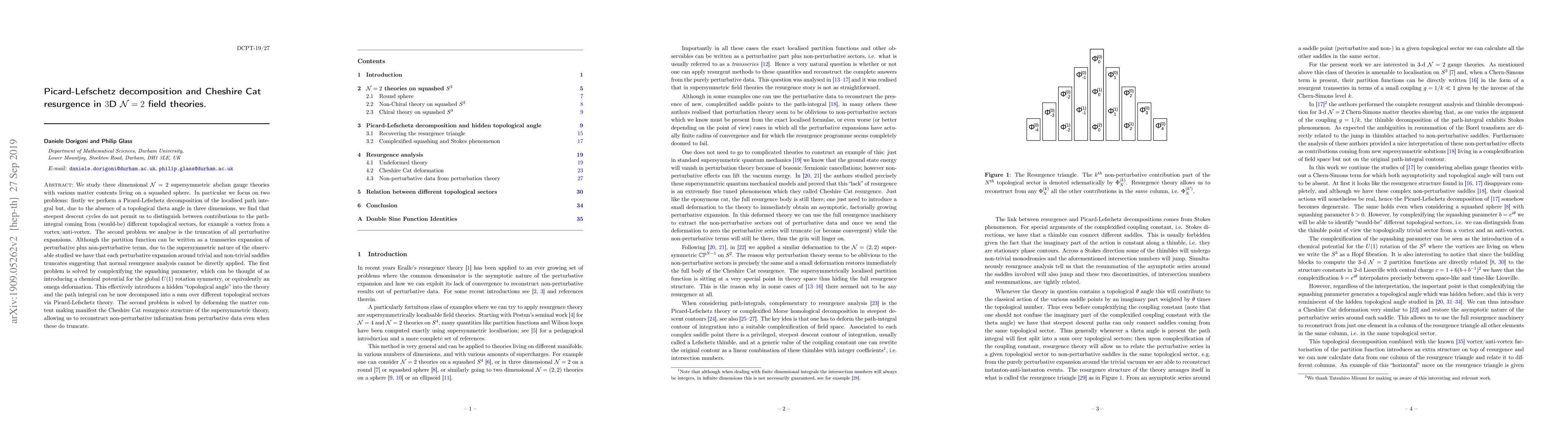 We study three dimensional $\mathcal{N}=2$ supersymmetric abelian gauge theories with various matter contents living on a squashed sphere. In particular we focus on two problems: firstly we perform a Picard-Lefschetz decomposition of the localised path integral but, due to the absence of a topological theta angle in three dimensions, we find that steepest descent cycles do not permit us to distinguish between contributions to the path-integral coming from (would-be) different topological sectors, for example a vortex from a vortex/anti-vortex. The second problem we analyse is the truncation of all perturbative expansions. Although the partition function can be written as a transseries expansion of perturbative plus non-perturbative terms, due to the supersymmetric nature of the observable studied we have that each perturbative expansion around trivial and non-trivial saddles truncates suggesting that normal resurgence analysis cannot be directly applied. The first problem is solved by complexifying the squashing parameter, which can be thought of as introducing a chemical potential for the global $U(1)$ rotation symmetry, or equivalently an omega deformation. This effectively introduces a hidden "topological angle" into the theory and the path integral can be now decomposed into a sum over different topological sectors via Picard-Lefschetz theory. The second problem is solved by deforming the matter content making manifest the Cheshire Cat resurgence structure of the supersymmetric theory, allowing us to reconstruct non-perturbative information from perturbative data even when these do truncate.
