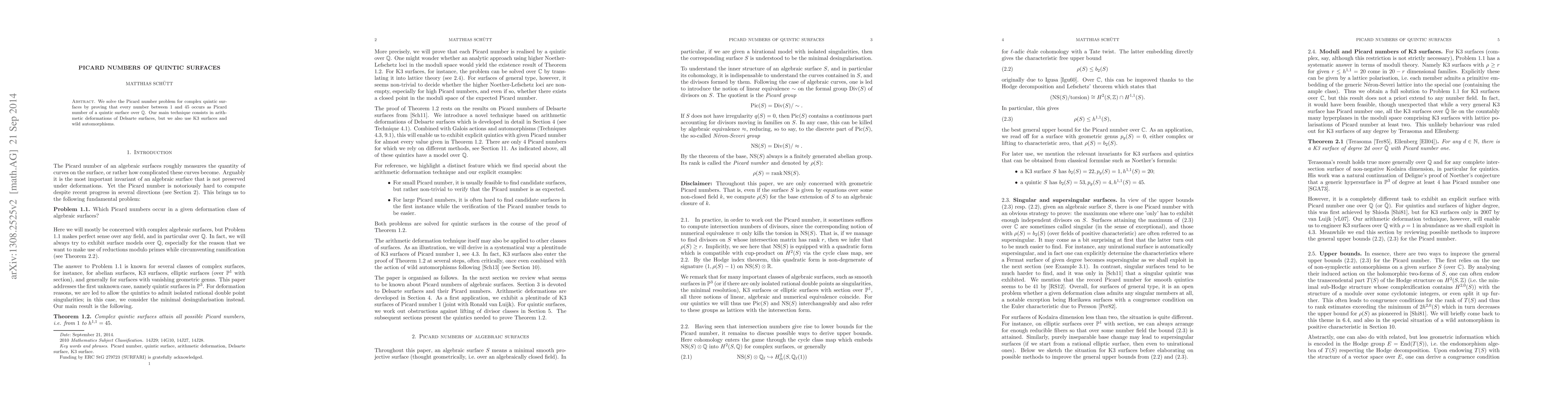 Summary: This paper proves that all integers from 1 to 45 can serve as Picard numbers for complex quintic surfaces over the rationals, utilizing arithmetic deformations of Delsarte surfaces, K3 surfaces, and wild automorphisms as key techniques.