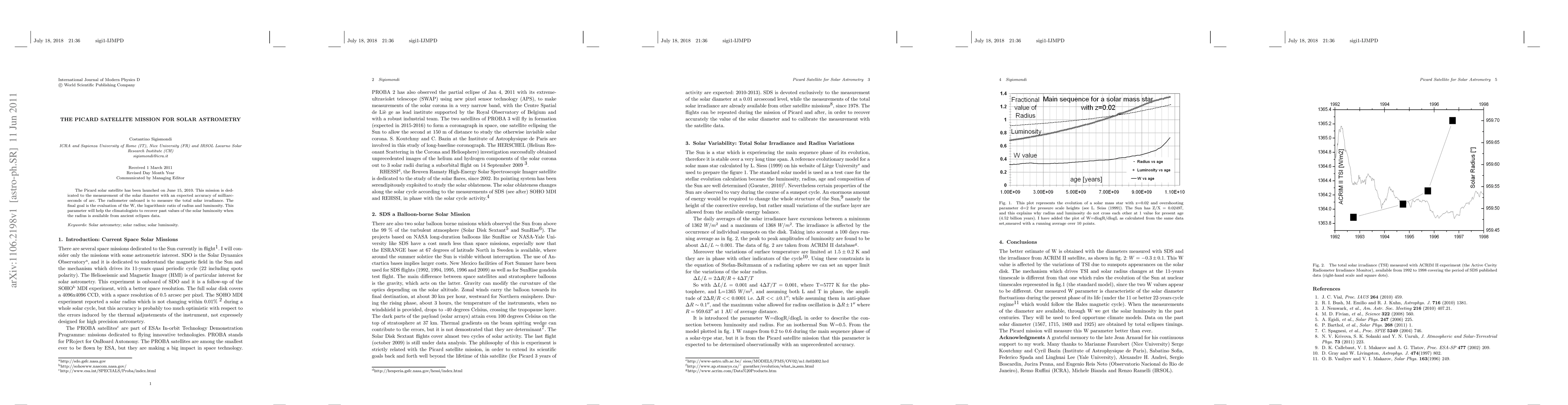 The Picard satellite, launched on June 15, 2010, aims to measure the solar diameter with high precision and assess the total solar irradiance, ultimately evaluating the W parameter to aid climatologists in reconstructing past solar luminosity.