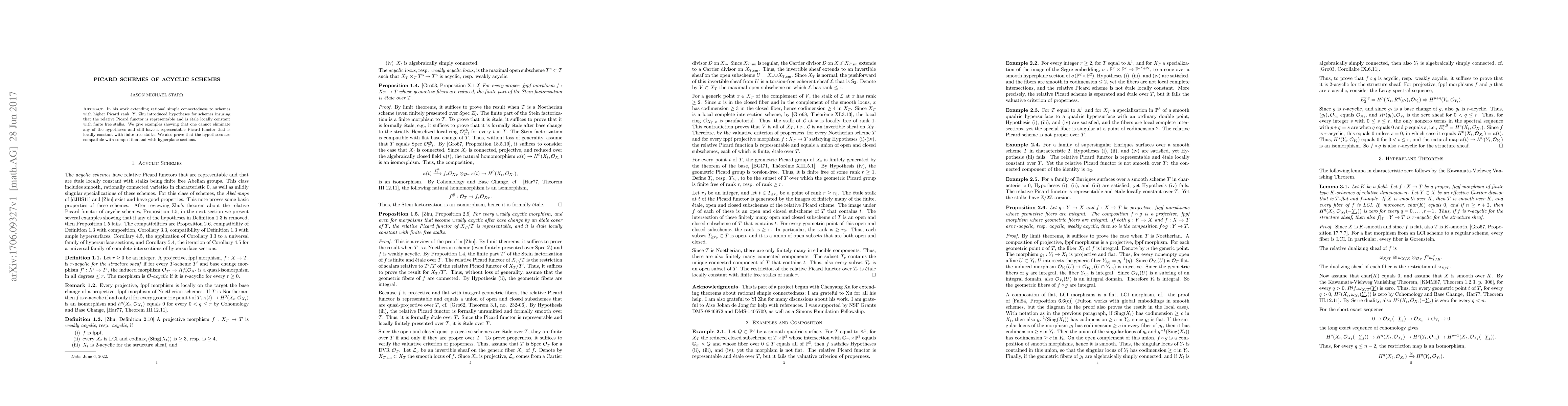 This paper explores the representability and properties of Picard functors for acyclic schemes under Zhu's hypotheses, demonstrating that none of the hypotheses can be omitted. It also proves the compatibility of these hypotheses with composition and hyperplane sections.