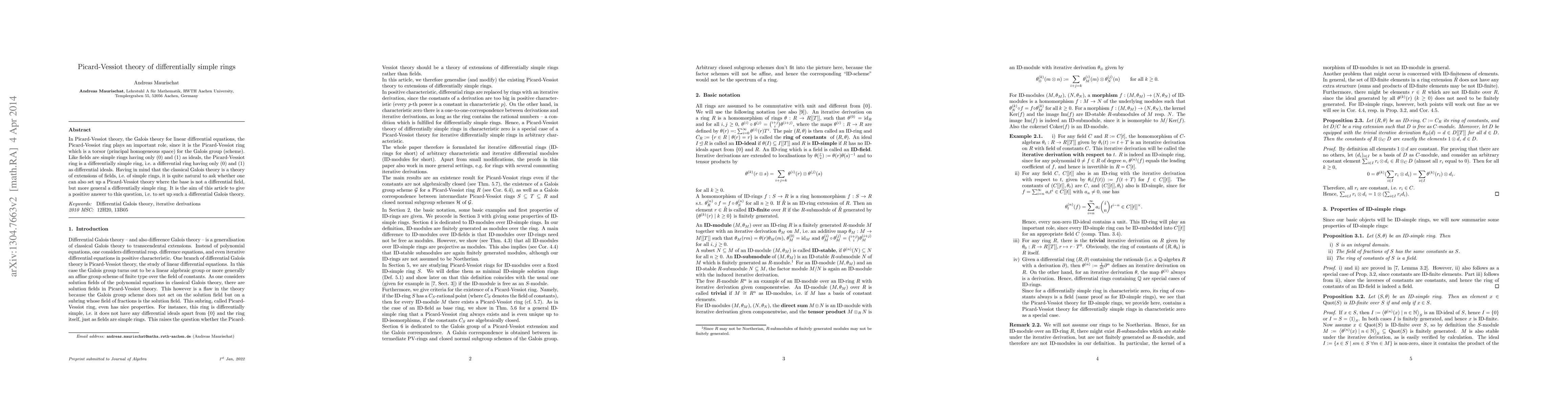 This paper develops a Picard-Vessiot theory for differentially simple rings, extending the classical Galois theory from fields to more general differentially simple rings, which have only the trivial differential ideals. The aim is to establish a differential Galois theory for these rings, analogous to the Galois theory for field extensions.
