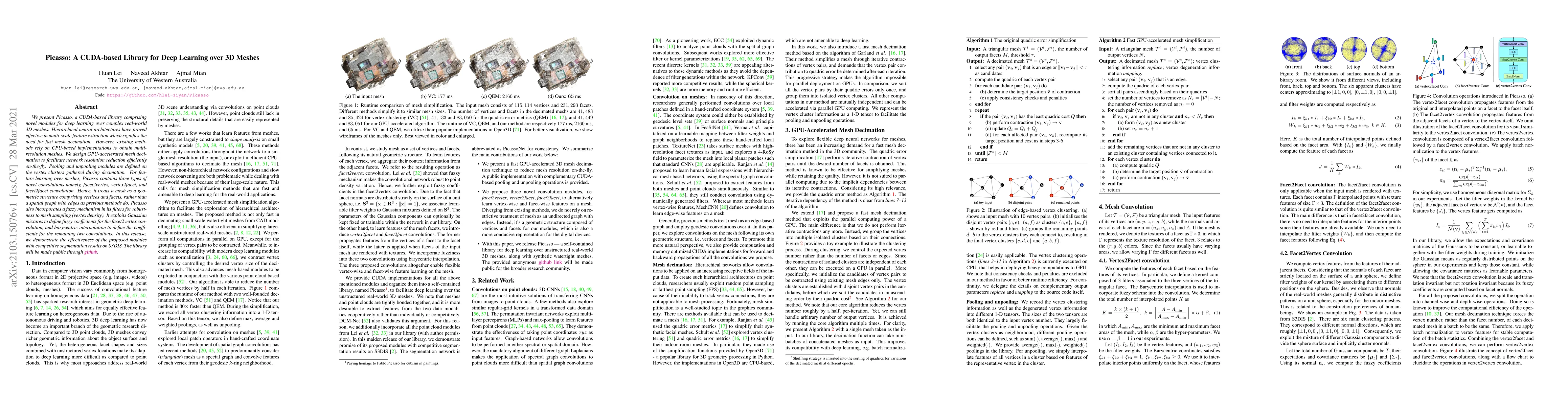 We present Picasso, a CUDA-based library comprising novel modules for deep learning over complex real-world 3D meshes. Hierarchical neural architectures have proved effective in multi-scale feature extraction which signifies the need for fast mesh decimation. However, existing methods rely on CPU-based implementations to obtain multi-resolution meshes. We design GPU-accelerated mesh decimation to facilitate network resolution reduction efficiently on-the-fly. Pooling and unpooling modules are defined on the vertex clusters gathered during decimation. For feature learning over meshes, Picasso contains three types of novel convolutions namely, facet2vertex, vertex2facet, and facet2facet convolution. Hence, it treats a mesh as a geometric structure comprising vertices and facets, rather than a spatial graph with edges as previous methods do. Picasso also incorporates a fuzzy mechanism in its filters for robustness to mesh sampling (vertex density). It exploits Gaussian mixtures to define fuzzy coefficients for the facet2vertex convolution, and barycentric interpolation to define the coefficients for the remaining two convolutions. In this release, we demonstrate the effectiveness of the proposed modules with competitive segmentation results on S3DIS. The library will be made public through https://github.com/hlei-ziyan/Picasso.