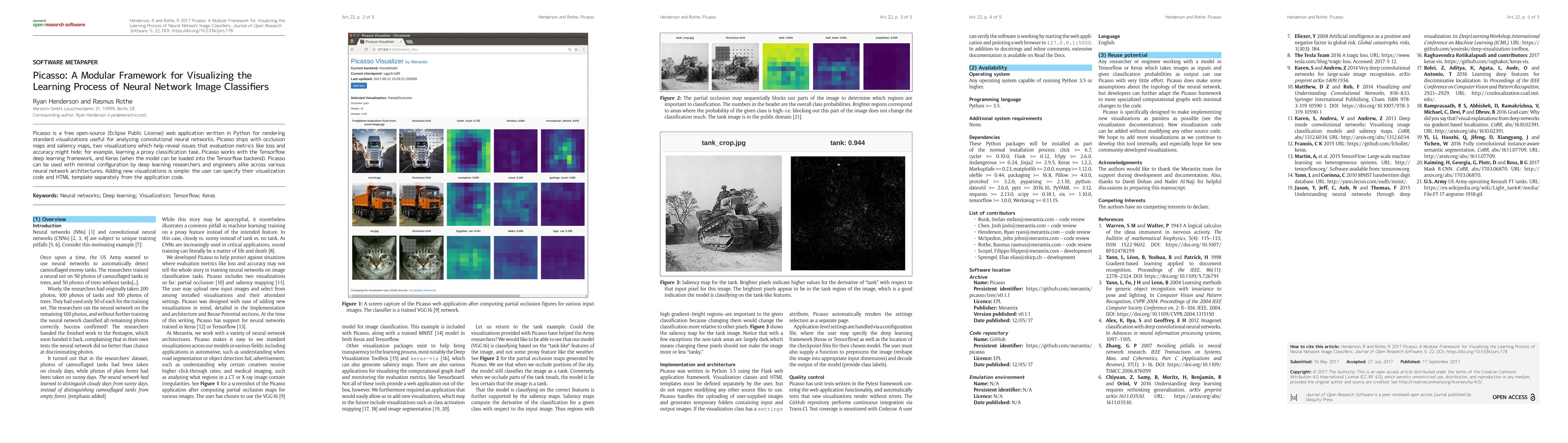 Picasso is a free open-source (Eclipse Public License) web application written in Python for rendering standard visualizations useful for analyzing convolutional neural networks. Picasso ships with occlusion maps and saliency maps, two visualizations which help reveal issues that evaluation metrics like loss and accuracy might hide: for example, learning a proxy classification task. Picasso works with the Tensorflow deep learning framework, and Keras (when the model can be loaded into the Tensorflow backend). Picasso can be used with minimal configuration by deep learning researchers and engineers alike across various neural network architectures. Adding new visualizations is simple: the user can specify their visualization code and HTML template separately from the application code.