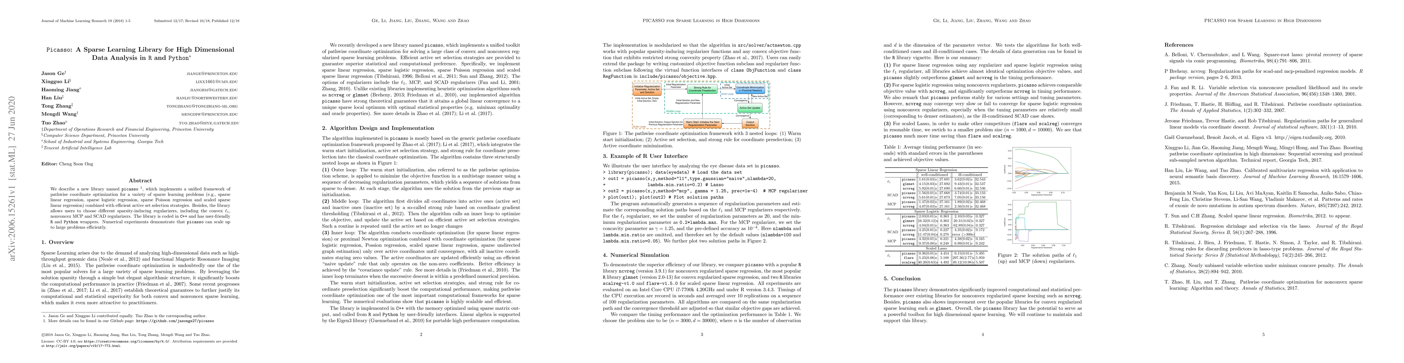 Picasso is a library for sparse learning in R and Python, implementing pathwise coordinate optimization for various sparse regression techniques and offering efficient active set selection. It supports multiple sparsity-inducing regularizers and scales effectively to large datasets.