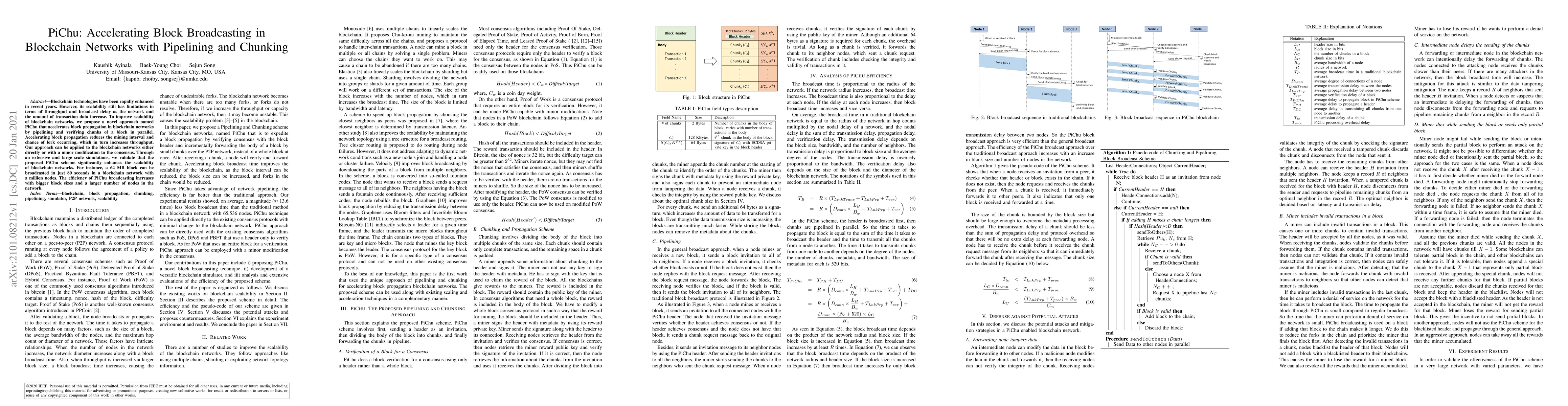 The paper proposes PiChu, a method to accelerate block broadcasting in blockchain networks by pipelining and chunking, which significantly enhances scalability by reducing mining intervals and broadcast delays. Through extensive simulations, PiChu demonstrates substantial improvements in throughput and scalability, especially for large blocks and networks with many nodes.