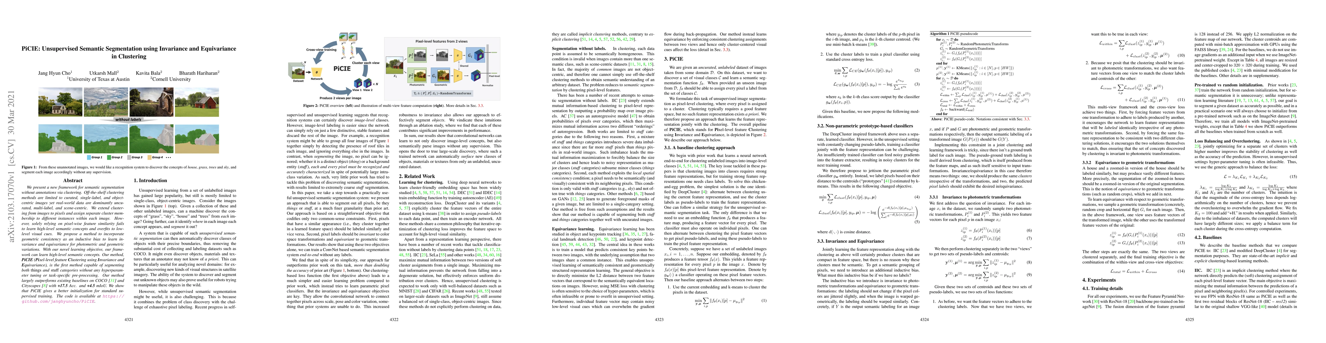 PiCIE introduces an unsupervised semantic segmentation framework that leverages invariance and equivariance in clustering to segment both things and stuff categories without annotations. It outperforms existing baselines on COCO and Cityscapes datasets and provides a better initialization for supervised training.