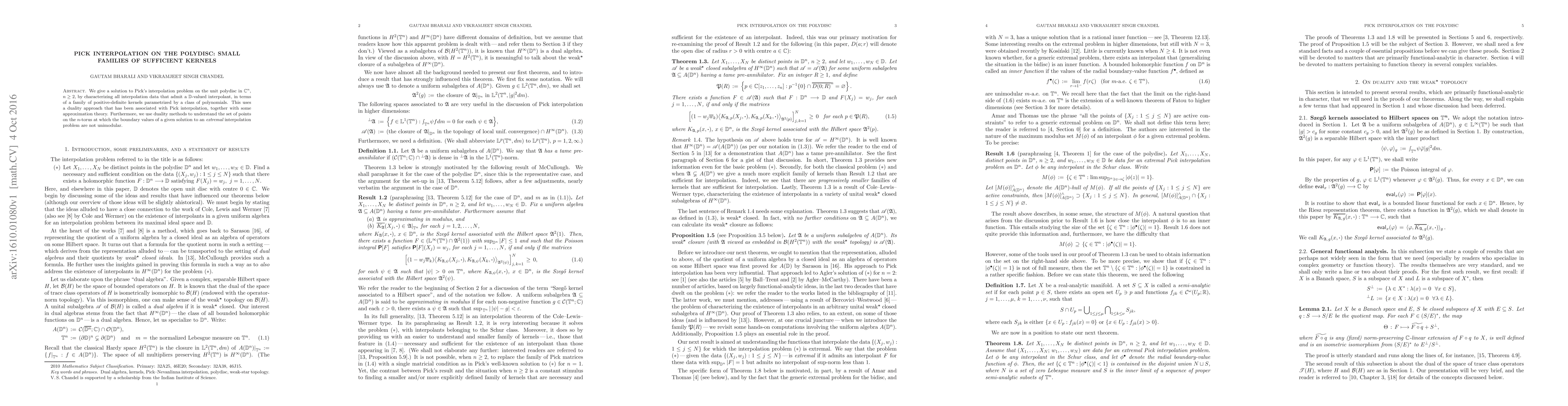 This paper solves Pick's interpolation problem on the unit polydisc in $\mathbb{C}^n$ by characterizing sufficient kernels using a family of positive-definite kernels. It employs duality methods and approximation theory to determine points on the $n$-torus where boundary values of extremal interpolation solutions are not unimodular.