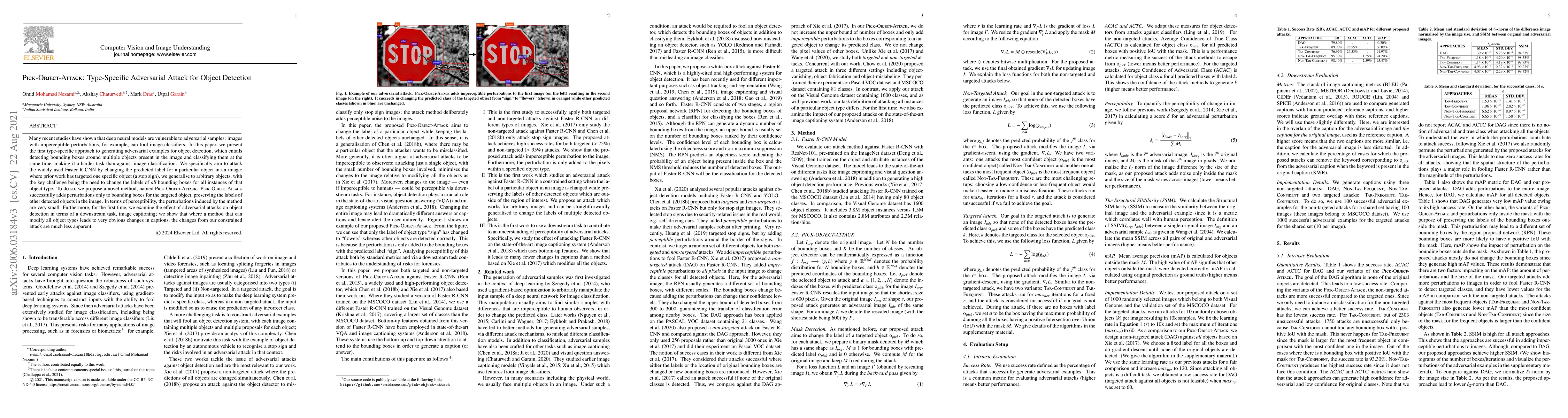 This paper introduces Pick-Object-Attack, a novel type-specific adversarial attack method for object detection, specifically targeting the Faster R-CNN model. The method successfully alters the predicted label of a specific object type while preserving the labels of other objects, demonstrating minimal perceptible changes and minimal impact on downstream tasks like image captioning.
