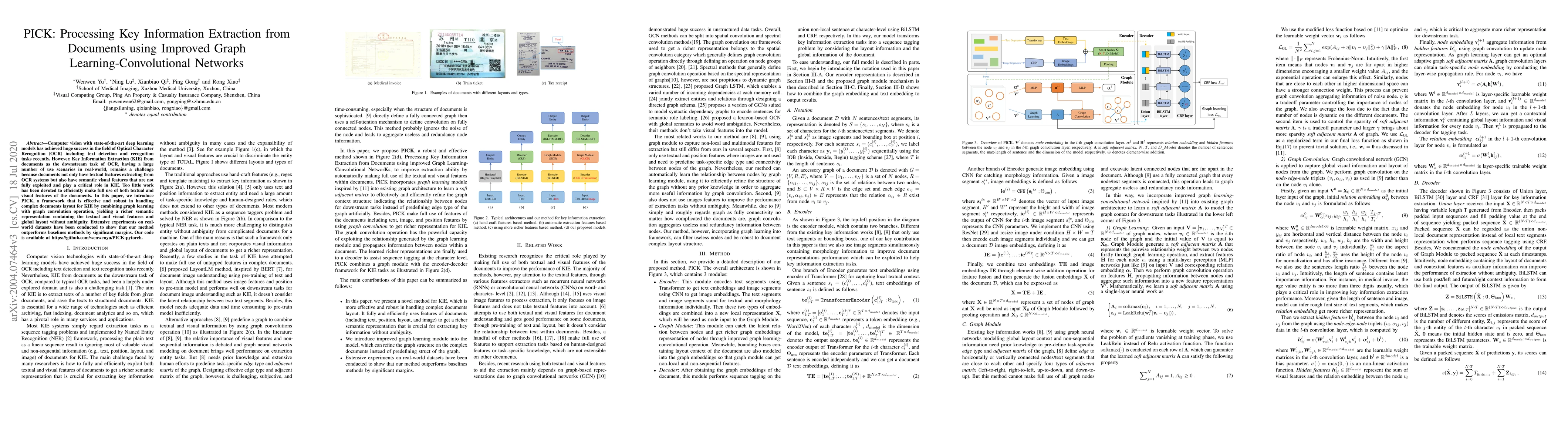 PICK introduces an improved graph learning-convolutional network framework for KIE, effectively combining textual and visual features with global layout information.