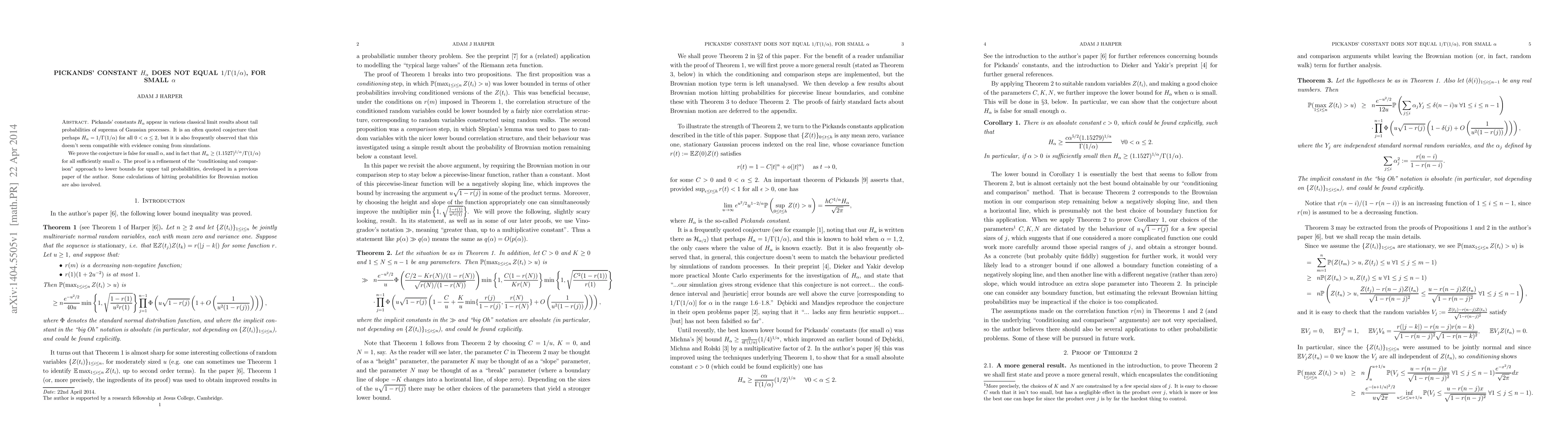 Pickands' constants $H_{\alpha}$ appear in various classical limit results about tail probabilities of suprema of Gaussian processes. It is an often quoted conjecture that perhaps $H_{\alpha} = 1/\Gamma(1/\alpha)$ for all $0 < \alpha \leq 2$, but it is also frequently observed that this doesn't seem compatible with evidence coming from simulations. We prove the conjecture is false for small $\alpha$, and in fact that $H_{\alpha} \geq (1.1527)^{1/\alpha}/\Gamma(1/\alpha)$ for all sufficiently small $\alpha$. The proof is a refinement of the "conditioning and comparison" approach to lower bounds for upper tail probabilities, developed in a previous paper of the author. Some calculations of hitting probabilities for Brownian motion are also involved.
