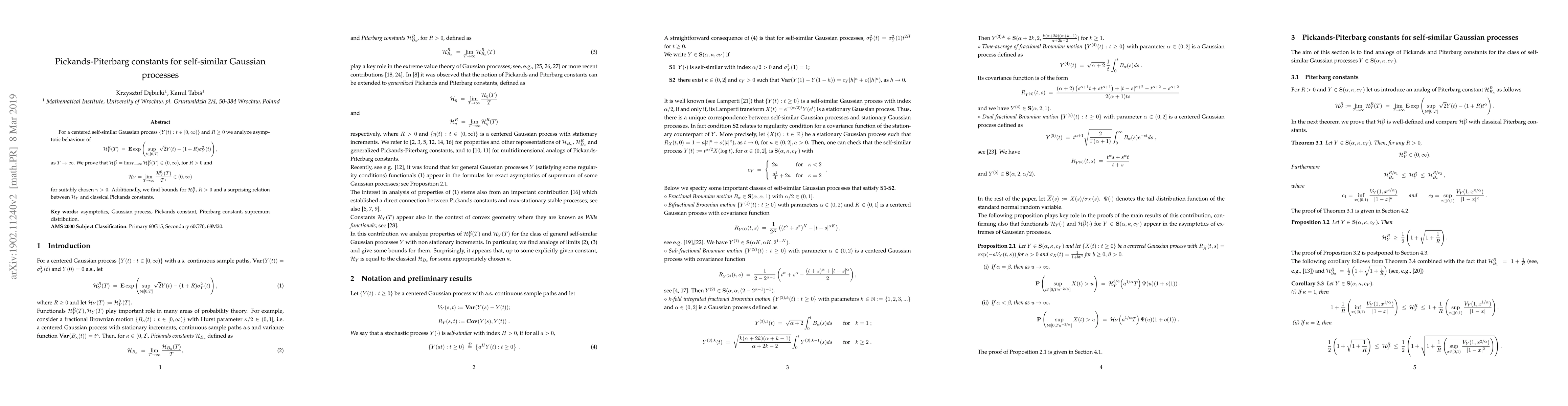 For a centered self-similar Gaussian process $\{Y(t):t\in[0,\infty)\}$ and $R\ge0$ we analyze asymptotic behaviour of \[ \mathcal{H}_Y^R(T) \; = \; \mathbf{E} \exp \left( \sup_{t \in [0,T]} \sqrt{2} Y(t) - (1+R) \sigma_Y^2(t) \right), \] as $T\to\infty$. We prove that $\mathcal{H}_Y^R=\lim_{T\to\infty} \mathcal{H}_Y^R(T)\in(0,\infty)$ for $R>0$ and \[\mathcal{H}_Y=\lim_{T\to\infty} \frac{\mathcal{H}_Y^0(T)}{T^\gamma}\in(0,\infty)\] for suitably chosen $\gamma>0$. Additionally, we find bounds for $\mathcal{H}_Y^R$, $R>0$ and a surprising relation between $\mathcal{H}_Y$ and classical Pickands constants.