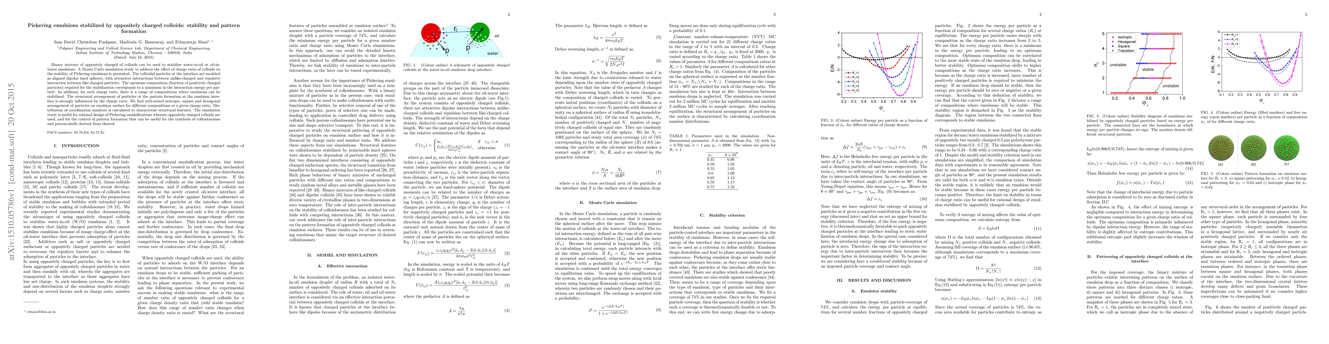 This paper investigates the stability and pattern formation in Pickering emulsions stabilized by oppositely charged colloids using Monte Carlo simulations. The study reveals that optimal stabilization occurs at a specific charge ratio, with various structural arrangements at the emulsion interface influenced by this ratio.