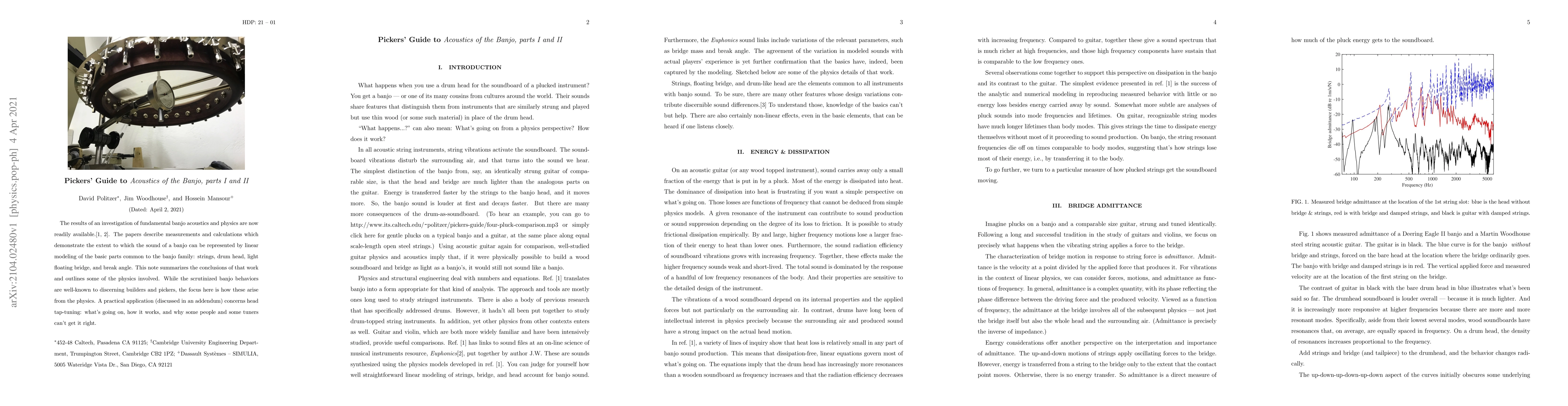 This two-part study investigates the acoustics and physics of the banjo, demonstrating how its sound can be modeled through linear analysis of its components: strings, drum head, floating bridge, and break angle. The research elucidates the underlying physics behind familiar banjo behaviors, with a practical application focusing on head tap-tuning techniques.