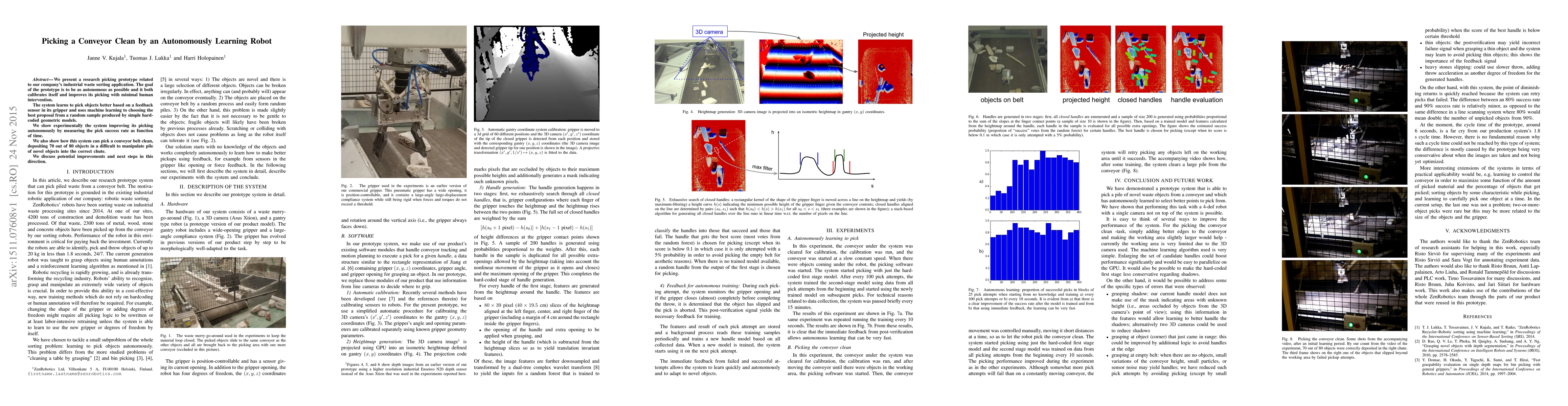 We present a research picking prototype related to our company's industrial waste sorting application. The goal of the prototype is to be as autonomous as possible and it both calibrates itself and improves its picking with minimal human intervention. The system learns to pick objects better based on a feedback sensor in its gripper and uses machine learning to choosing the best proposal from a random sample produced by simple hard-coded geometric models. We show experimentally the system improving its picking autonomously by measuring the pick success rate as function of time. We also show how this system can pick a conveyor belt clean, depositing 70 out of 80 objects in a difficult to manipulate pile of novel objects into the correct chute. We discuss potential improvements and next steps in this direction.